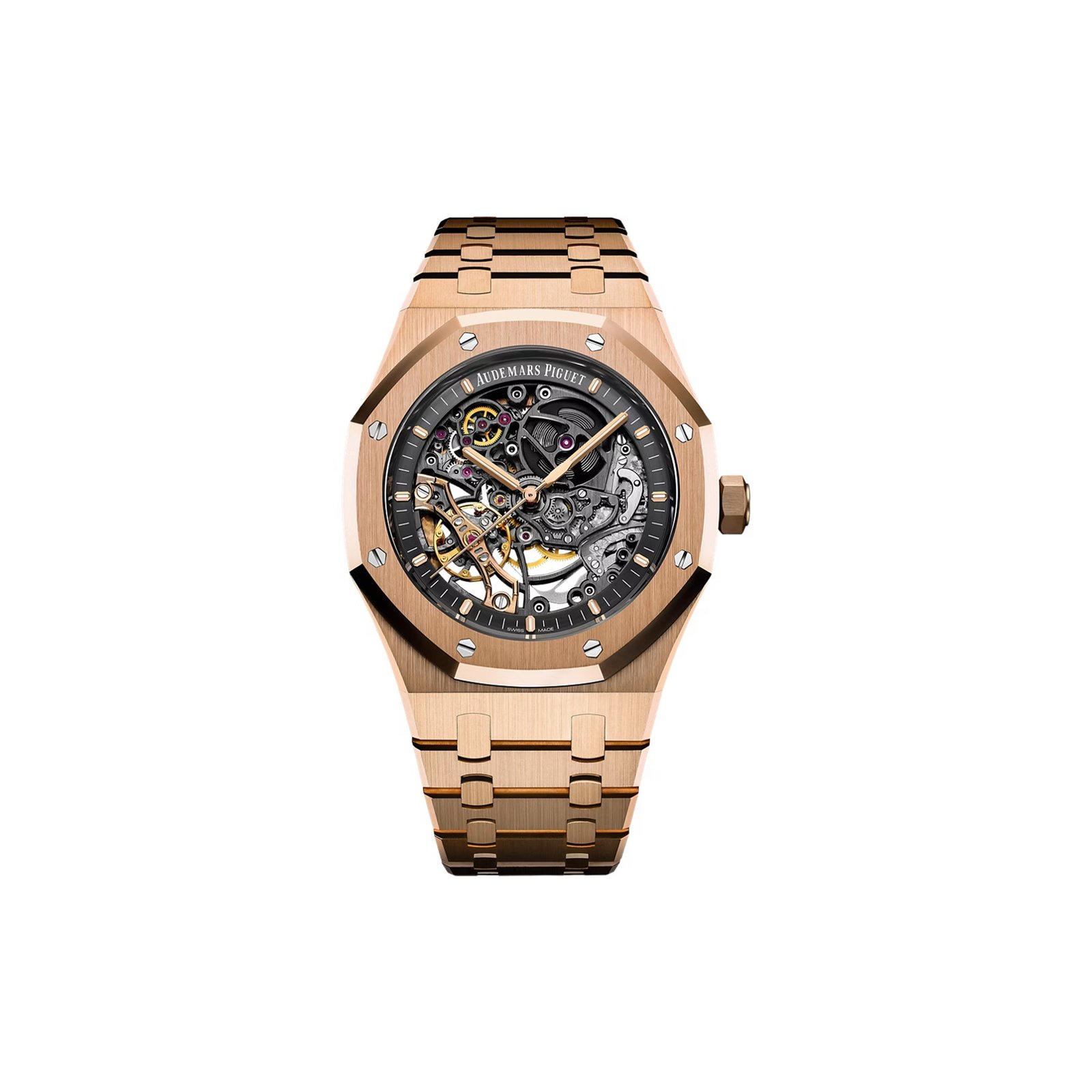 Dial:Slate grey openworked dial, pink gold applied hour-markers and Royal Oak hands with luminescent coating.
