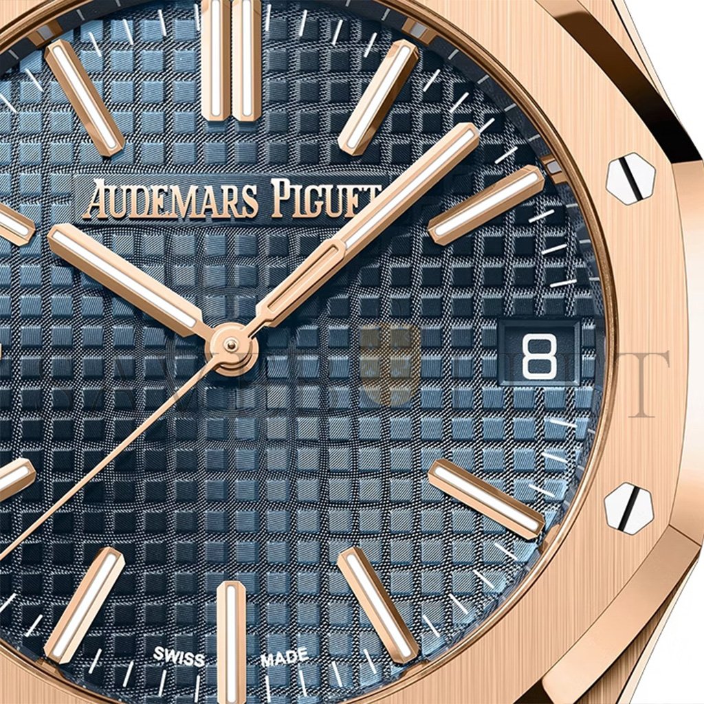 Dial:’Bleu nuit nuage 50′ dial with ‘Grande Tapisserie’ pattern, pink gold applied hour-markers and Royal Oak hands with luminescent coating.
