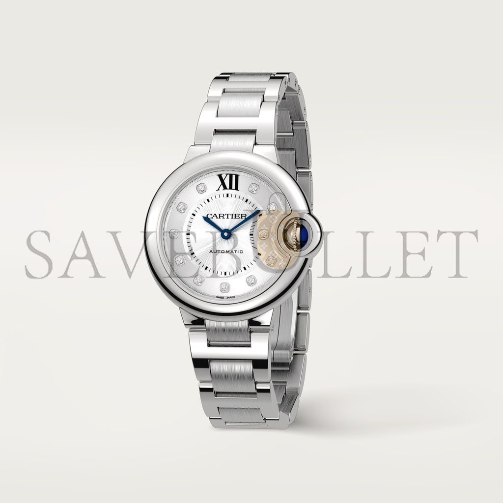 Ballon Bleu de Cartier watch, 33 mm, mechanical movement with automatic winding. Case in steel, fluted crown set with a synthetic cabochon-shaped spinel. Silvered guilloch茅 dial set with 11 brilliant-cut diamonds totalling 0.05 carat. Blued-steel sword-shaped hands. Sapphire crystal. Interchangeable steel bracelet. Thickness: 10.16 mm. Water-resistant to 3 bar (approx. 30 metres)