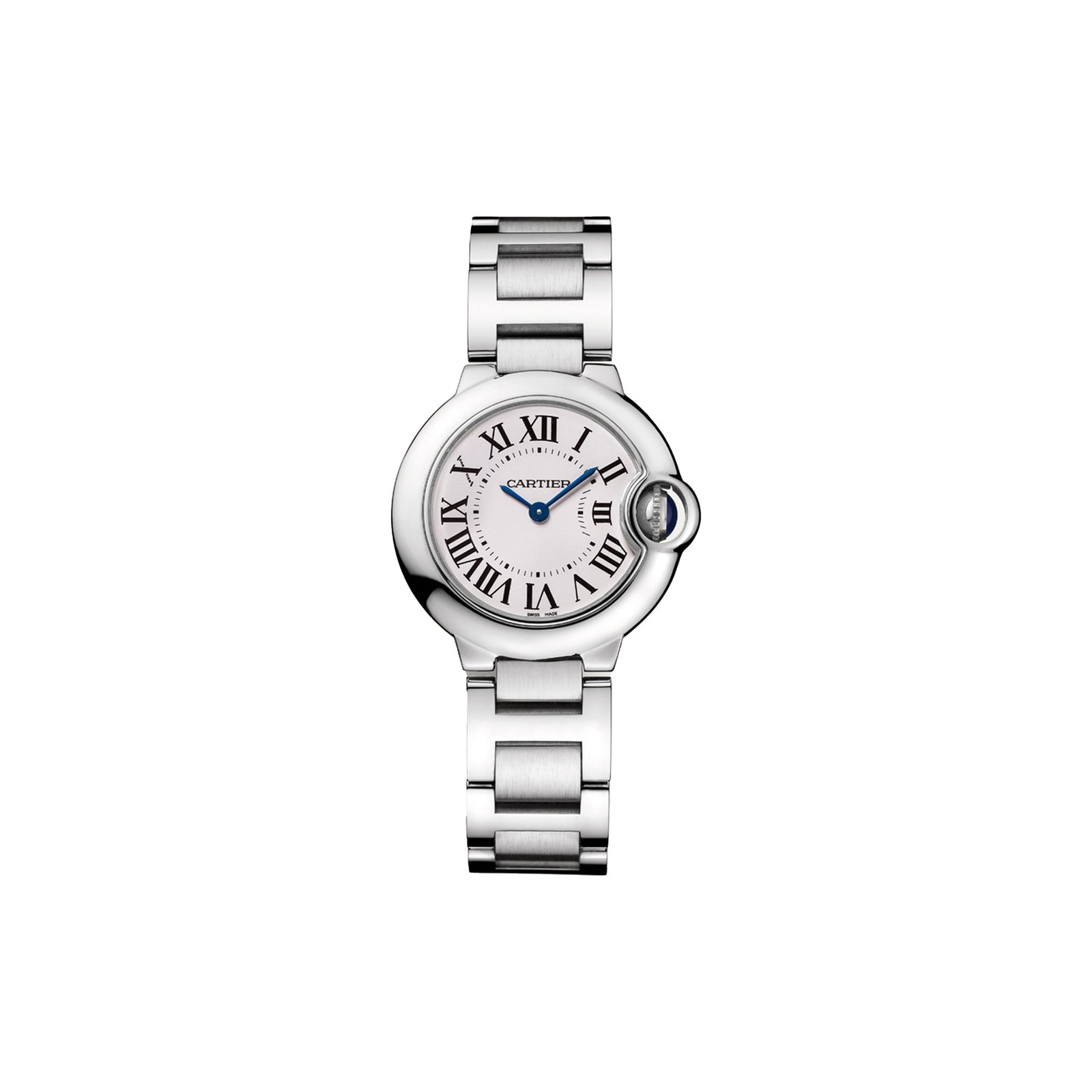 Ballon Bleu de Cartier watch, 28 mm, quartz movement. Steel case, fluted crown set with a synthetic spinel cabochon, silvered opaline dial, Roman numerals, sword-shaped hands in blued steel, sapphire crystal, steel bracelet. Case dimensions: diameter: 28.6 mm, thickness: 9.35 mm. Water-resistant to 30 metres/100 feet.