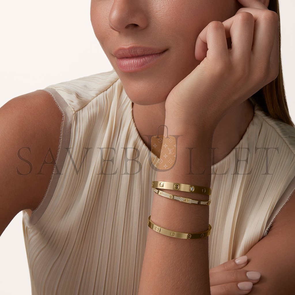 Love bracelet, classic model, 7501000 yellow gold, brushed finish, set with 4 brilliant-cut diamonds, total weight 0.42 carats. Features a unique clasp mechanism consisting of two functional screws.