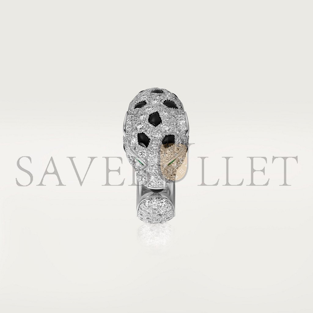 Panth猫re de Cartier ring, white gold 750/1000, onyx, set with 2 emeralds and 242 brilliant-cut diamonds totalling 2.21 carats.