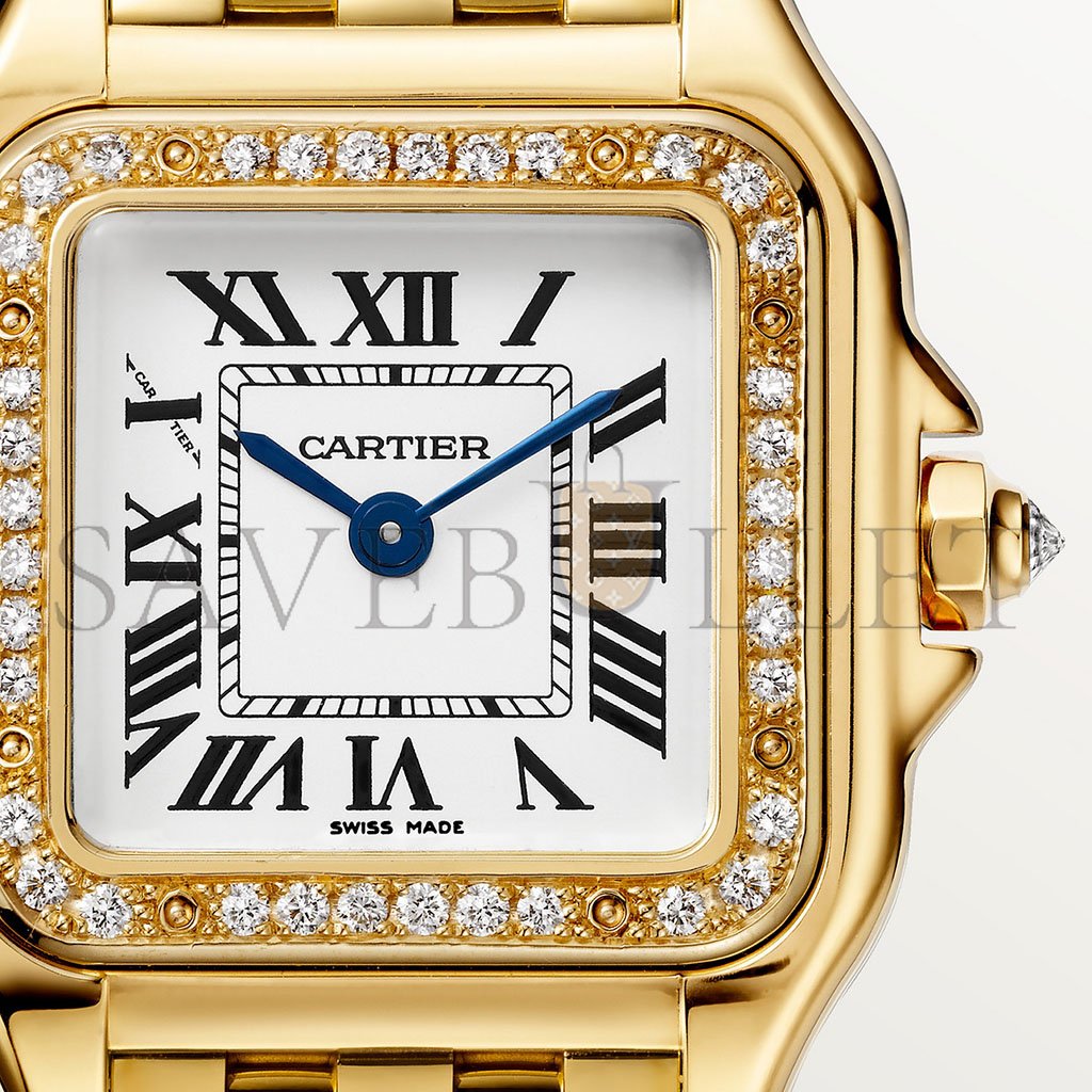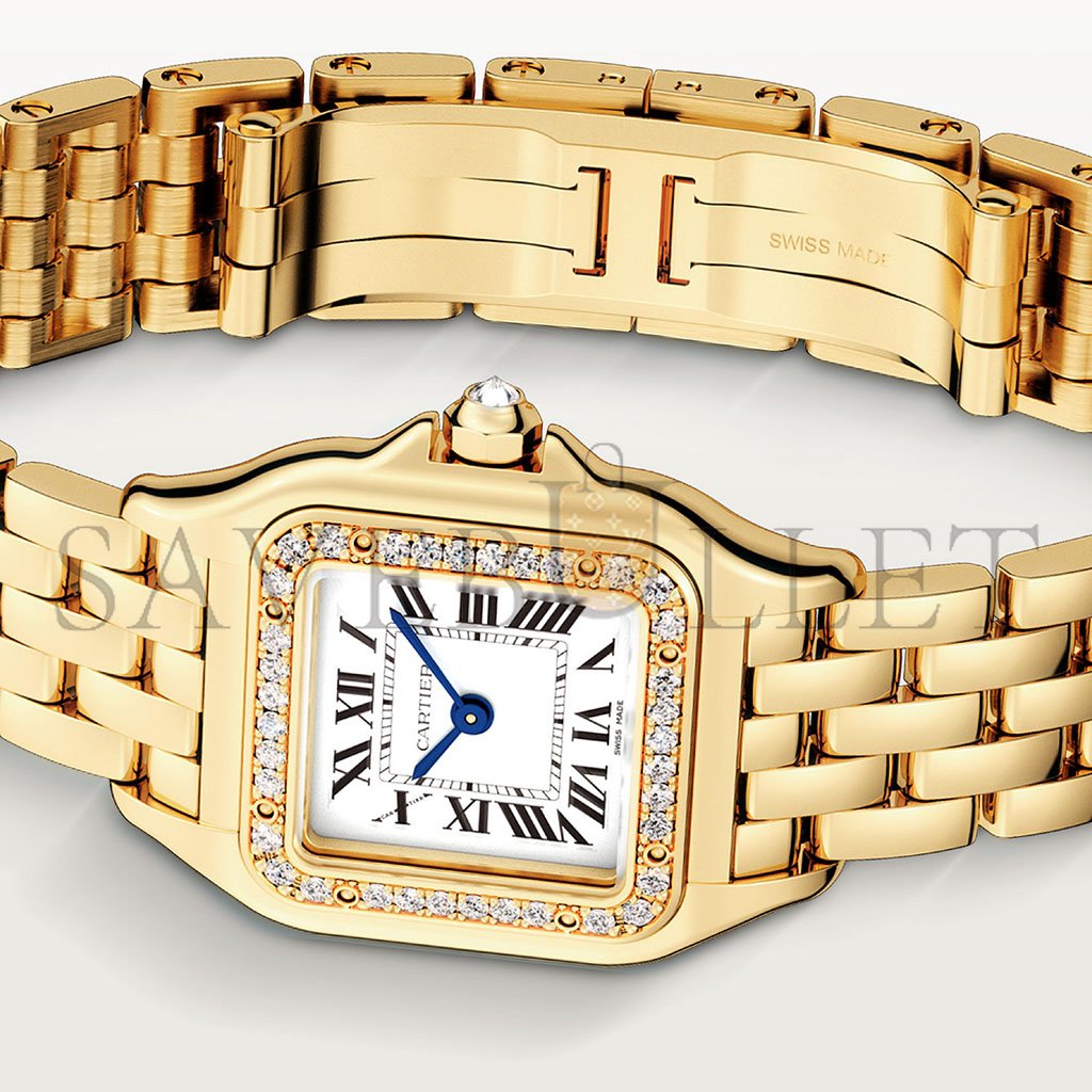 Panth猫re de Cartier watch, small model, quartz movement. Case in yellow gold 750/1000 set with brilliant-cut diamonds, dimensions: 22 mm x 30 mm, thickness: 6 mm, crown set with a diamond, silvered dial, blued-steel sword-shaped hands, yellow gold 750/1000 bracelet, water-resistant to 3 bar (approx. 30 metres).�