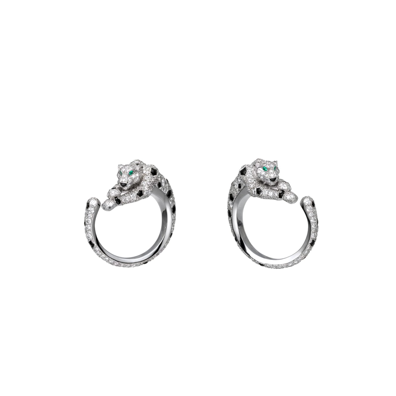 Panth猫re de Cartier hoop earrings, white gold 750/1000, each set with 2 emerald eyes, 21 onyx spots, 1 onyx nose and 239 diamonds totalling 3.11 carats.