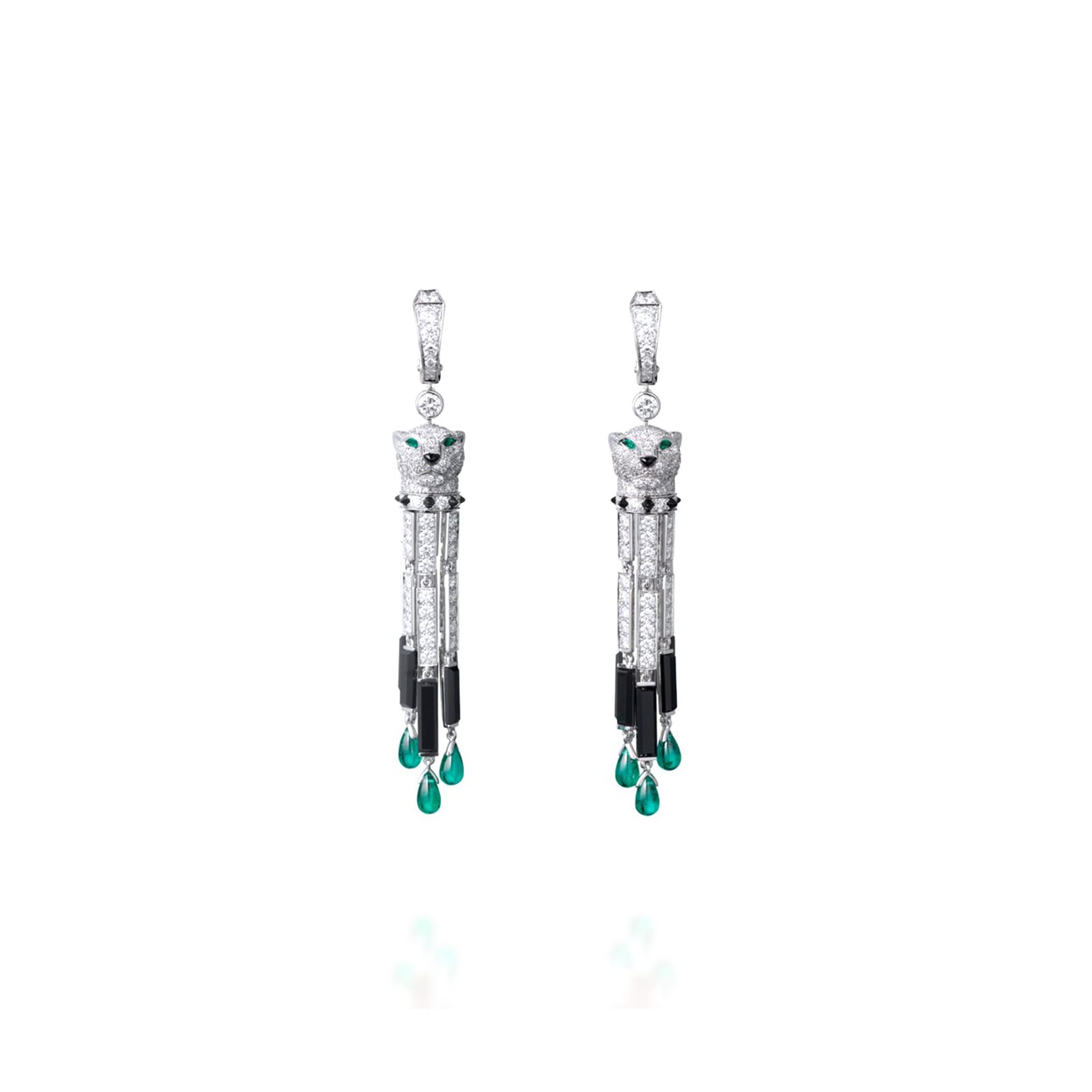 Panth猫re de Cartier earrings, white gold 750/1000, each set with 5 emeralds, 1 onyx nose, 13 onyx stones, and 444 brilliant-cut diamonds totalling 5.95 carats.