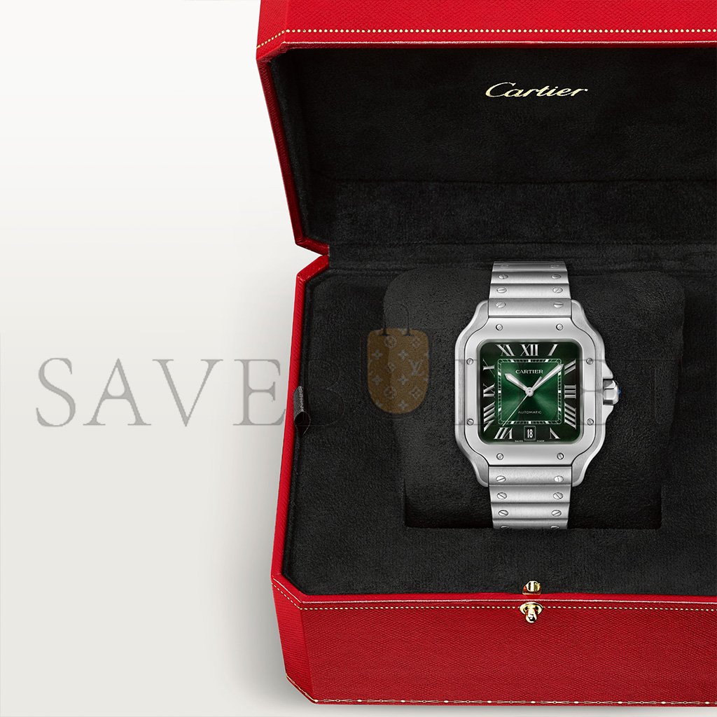 Santos de Cartier watch, large model, mechanical movement with automatic winding 1847 MC. Steel case, 7-sided crown set with a synthetic faceted blue spinel, graduated green dial, polished steel sword-shaped hands with luminescent material, sapphire crystal. �Case width: 39.8 mm, thickness: 9.38 mm. Water-resistant up to 10 bar (approx. 100 meters/330 feet).