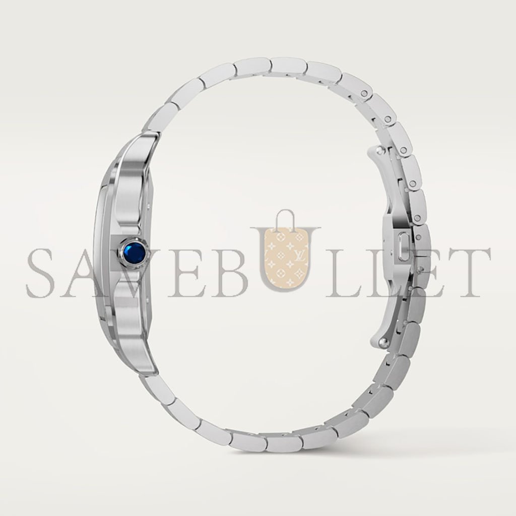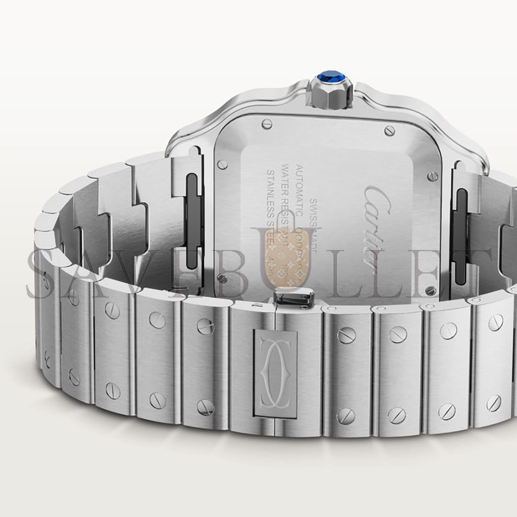 Santos de Cartier watch, large model, mechanical movement with automatic winding 1847 MC. Steel case, 7-sided crown with synthetic faceted blue spinel, graduated blue dial, polished steel sword-shaped hands with luminescent material, sapphire crystal. Steel bracelet with SmartLink adjustment system. Second strap in blue alligator skin, with interchangeable folding steel buckle. Both are fitted with the QuickSwitch interchangeable system. Case width: 39.8 mm, thickness: 9.38 mm. Water-resistant up to 10 bar (approx. 100 meters/330 feet).