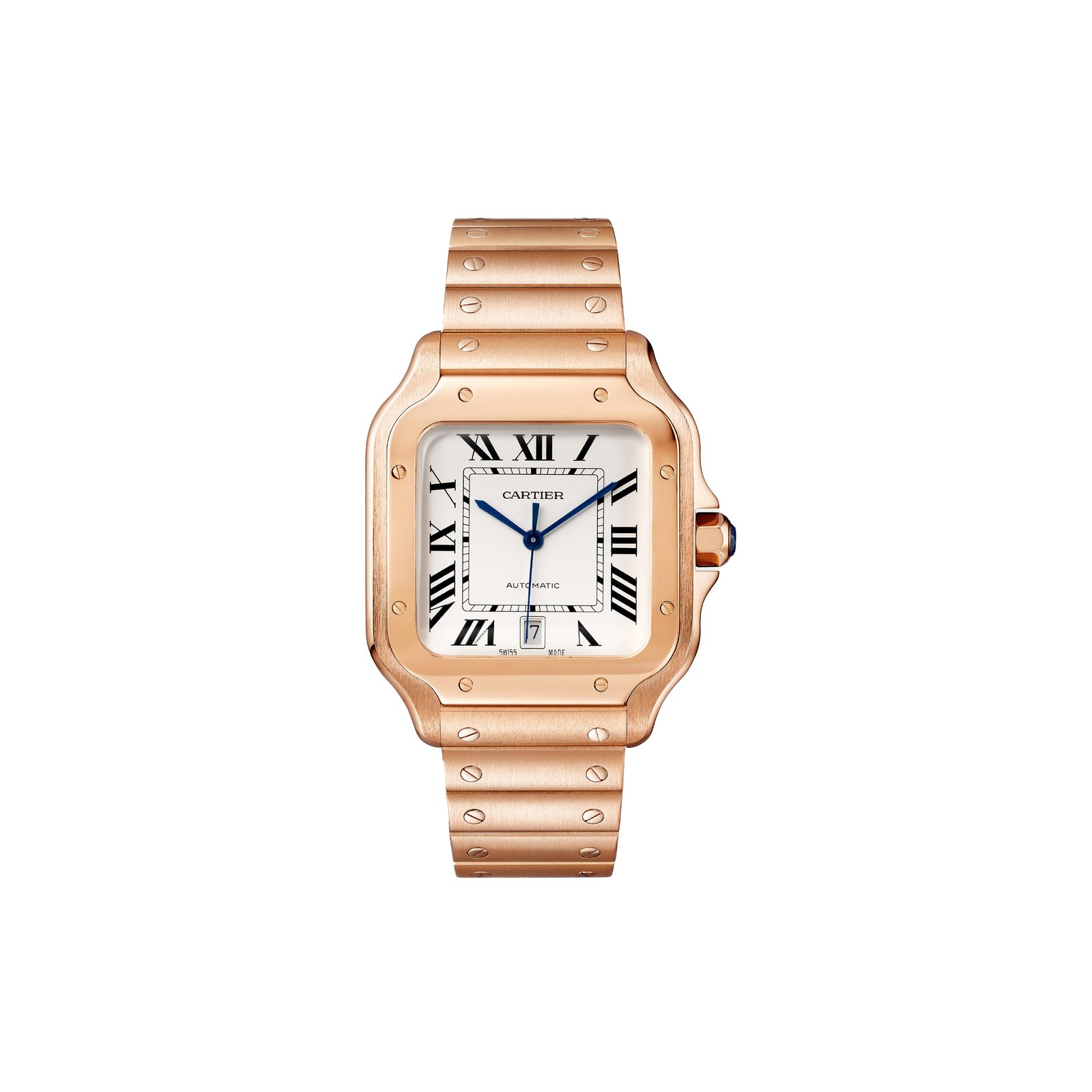 Santos watch, large model, mechanical movement with automatic winding, caliber 1847 MC. Rose gold 750/1000 case, rose gold 750/1000 7-sided crown set with a faceted sapphire, silvered opaline dial, blued-steel sword-shaped hands, sapphire crystal. Bracelet in rose gold 750/1000 with ��SmartLink��adjustment system. Case width: 39.8 mm, thickness: 9.38 mm. Water-resistant up to 10 bar (approx. 100 meters/ 328 feet).