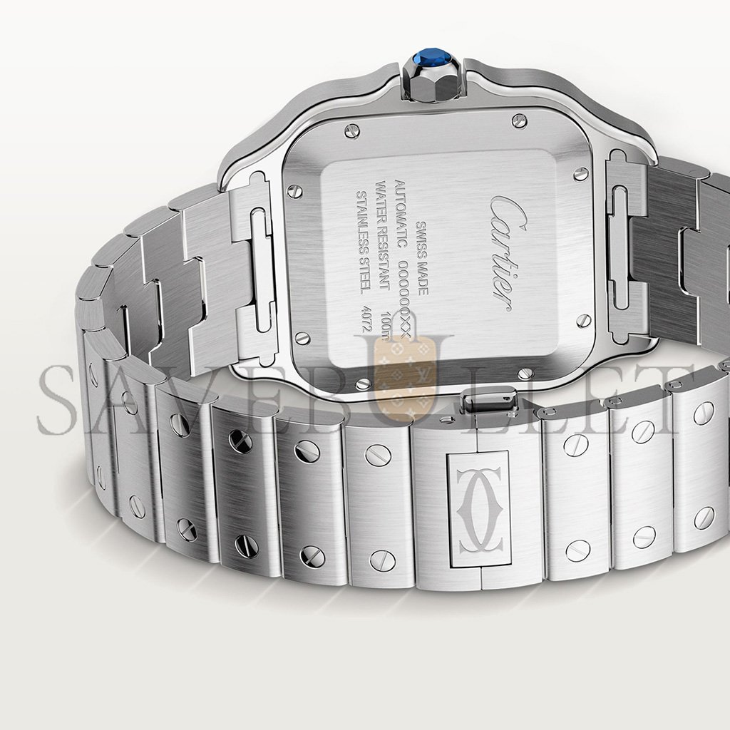 Santos watch, large model, mechanical movement with automatic winding, caliber 1847 MC. Steel case, 7-sided crown set with a faceted synthetic spinel, graduated blue dial, steel sword-shaped hands, sapphire crystal. Steel bracelet with “SmartLink” adjustment system. Case width: 39.8 mm, thickness: 9.38mm. Water-resistant to 10 bar (approx. 100 meters/330 feet).