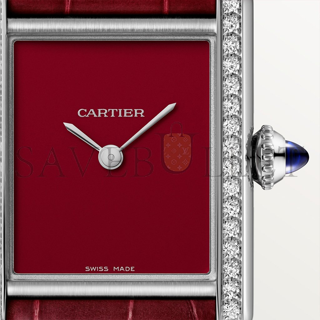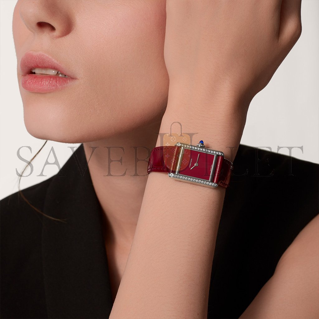 Tank Must watch, small model, quartz movement. Steel case set with 40 diamonds totaling 0.39 carats, beaded crown with synthetic blue cabochon-shaped spinel. Red lacquer dial, rhodium-finish steel sword-shaped hands, sapphire crystal. Shiny burgundy alligator-skin strap, steel ardillon buckle. Case dimensions: 27 mm x 22 mm. Thickness: 6.6 mm. Water-resistant up to 3 bar (approx. 30 meters/100 feet).