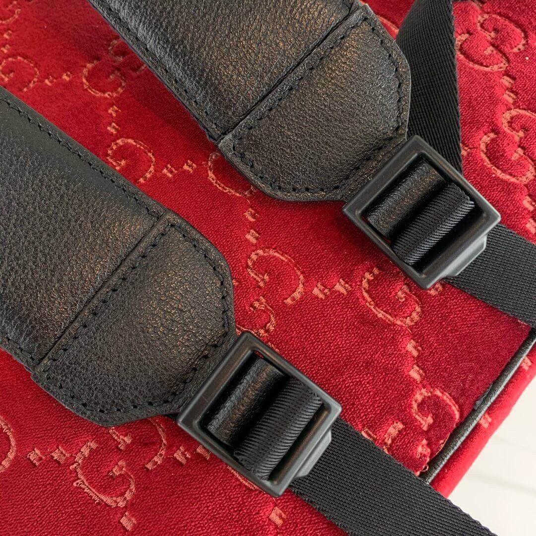 The backpack is presented in a smaller silhouette for Pre-Fall 2019, in dark blue GG velvet with leather trims. The distinctive GG motif is embedded into the soft velvet fabric, contrasted by black leather buckles, trims and gold-toned hardware. The padded leather straps feature a hidden House detail, with the blue and red stripe at the interior.