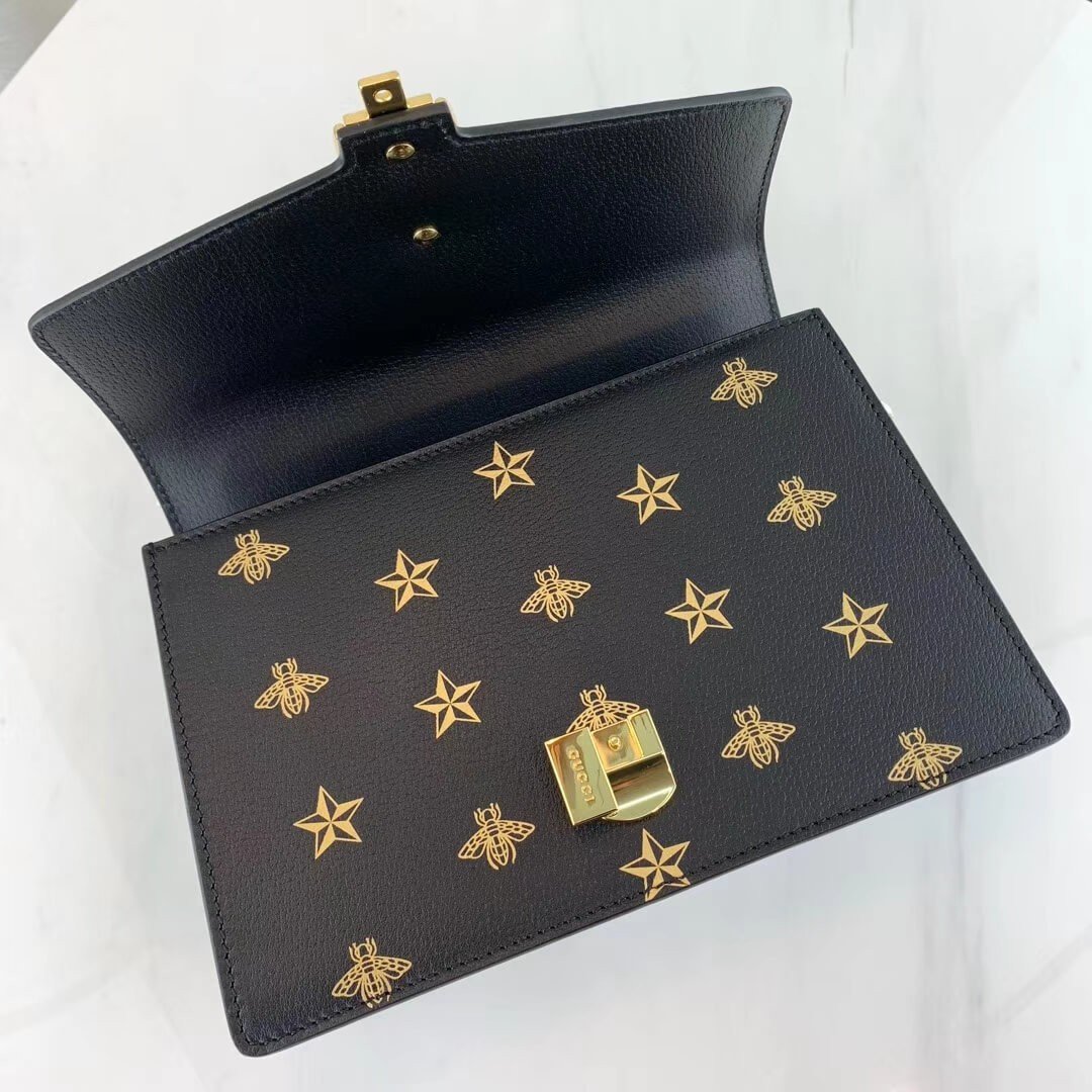 A playful mix of House codes, the Sylvie shoulder bag combines a gold metal chain and buckle with contrasting Web stripe details. The signature Gucci shape from the ’60s and ’70s is brought back from the archives in a modern iteration, presented in bees and stars printed leather. The structured silhouette comes with two straps: one leather shoulder strap and one grosgrain ribbon that converts from top handle to shoulder.