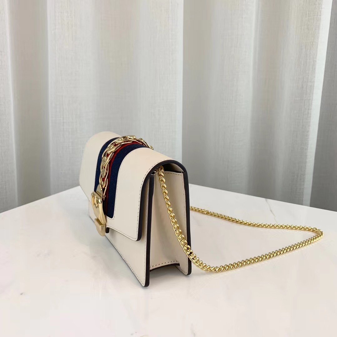he Sylvie mini chain bag features the nylon Web embedded under the leather and decorated with a gold chain and buckle. The metal buckle closure was taken from the House’s archives. Made in our smooth, classic leather.