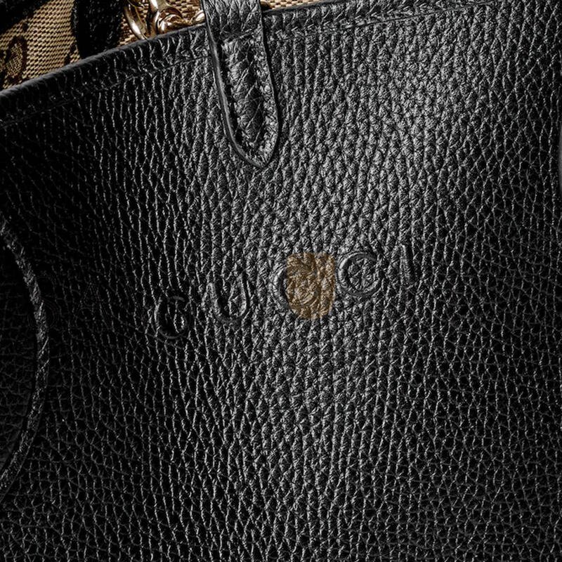 Black grainy leather on one side, beige and dark brown GG canvas on the other
