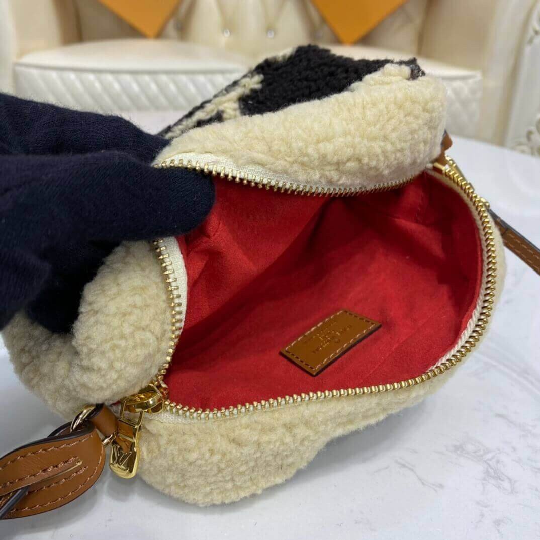 For the LV Teddy special edition, Louis Vuitton’s Beach Pouch is transformed into a chic winter accessory in fluffy shearling. An elaborate intarsia technique is used to create a giant LV in tones of beige and brown. A name tag and shoulder strap complete this design.