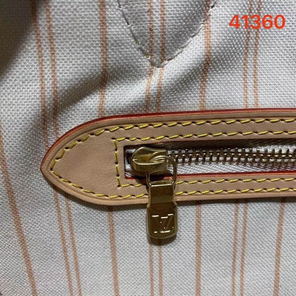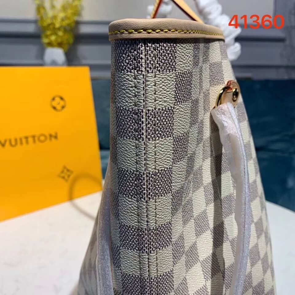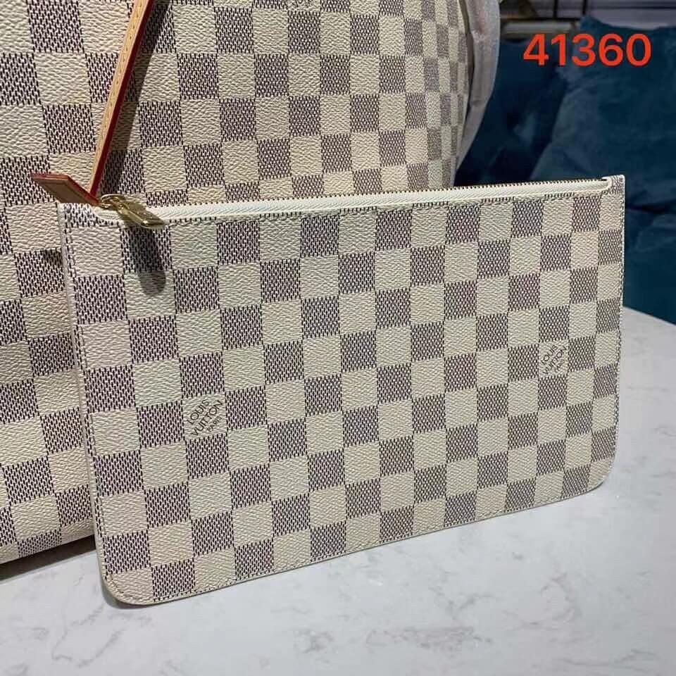 Legendary Neverfull: always exactly what you need it to be. Capacious but not bulky, structured yet supple, at home on the town or in the country. Cinch the side laces, and voilà! it’s a sleek city bag. Loosen them and you have a chic, practical tote. The slim leather handles fit over the shoulder or on the arm. Shown here in Damier Azur canvas.