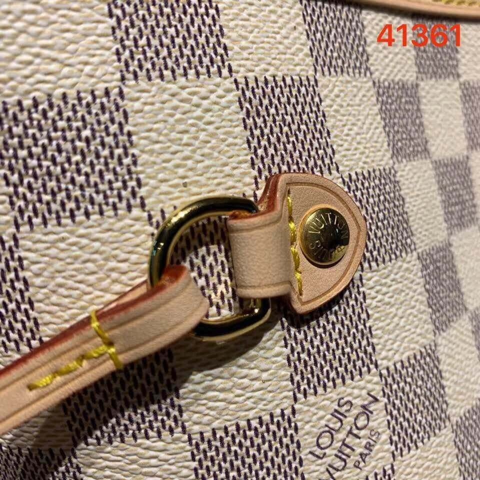 Legendary Neverfull: always exactly what you need it to be. Capacious but not bulky, structured yet supple, at home on the town or in the country. Cinch the side laces, and voilà! it’s a sleek city bag. Loosen them and you have a chic, practical tote. The slim leather handles fit over the shoulder or on the arm. Shown here in Damier Azur canvas.