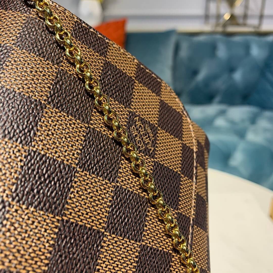The versatile Pochette Favorite looks delightful in Damier Ebène canvas. Its pure, feminine shape makes it ideal for all occasions.