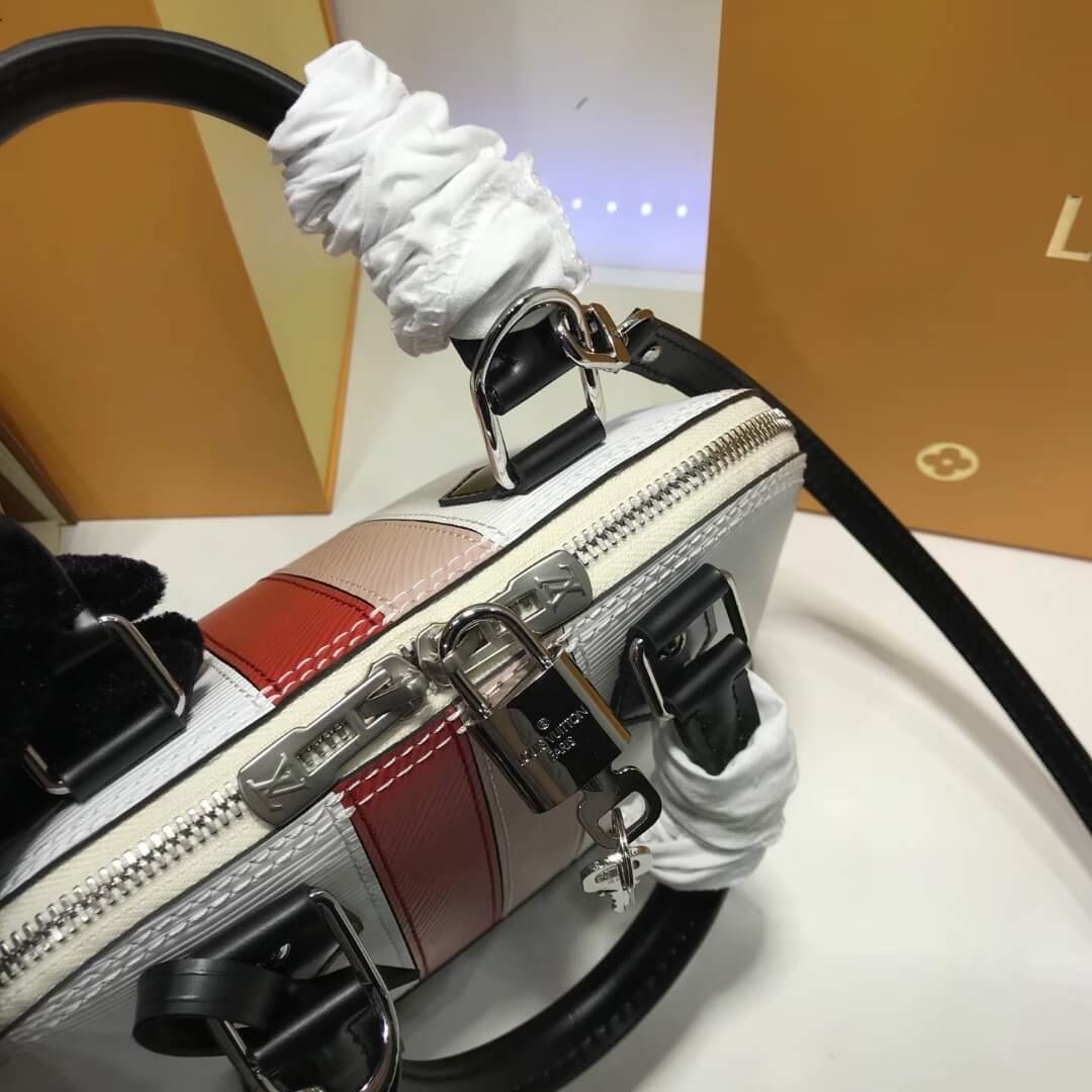This Alma BB handbag is crafted of grained Epi leather with smooth leather trim and two eye-catching stripes. The two-tone stripe, a theme seen on shoes at the Fall 2018 Collection, is a nod to the House’s trunk making and personalization Heritage. Playful but practical, it easily holds keys, wallet, smartphone and lipstick. The removable strap brings versality to the Alma BB, which can also be worn over the shoulder or across the body.