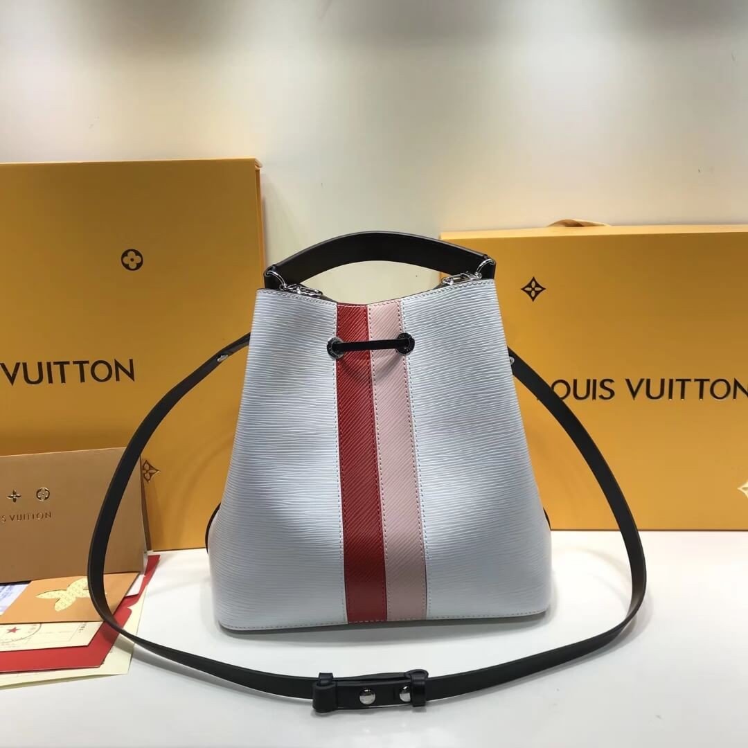 This NéoNoé handbag is crafted of grained Epi leather with smooth leather trim and two eye-catching stripes which bring a fresh feel to the emblematic model. The two-tone stripe, a traversal theme seen on shoes at the Fall 2018 Collection, is a nod to the House’s trunk making and personalization Heritage. The Néonoé bucket bag can be carried over the shoulder with its adjustable strap or by hand, thanks to the removable top handle.