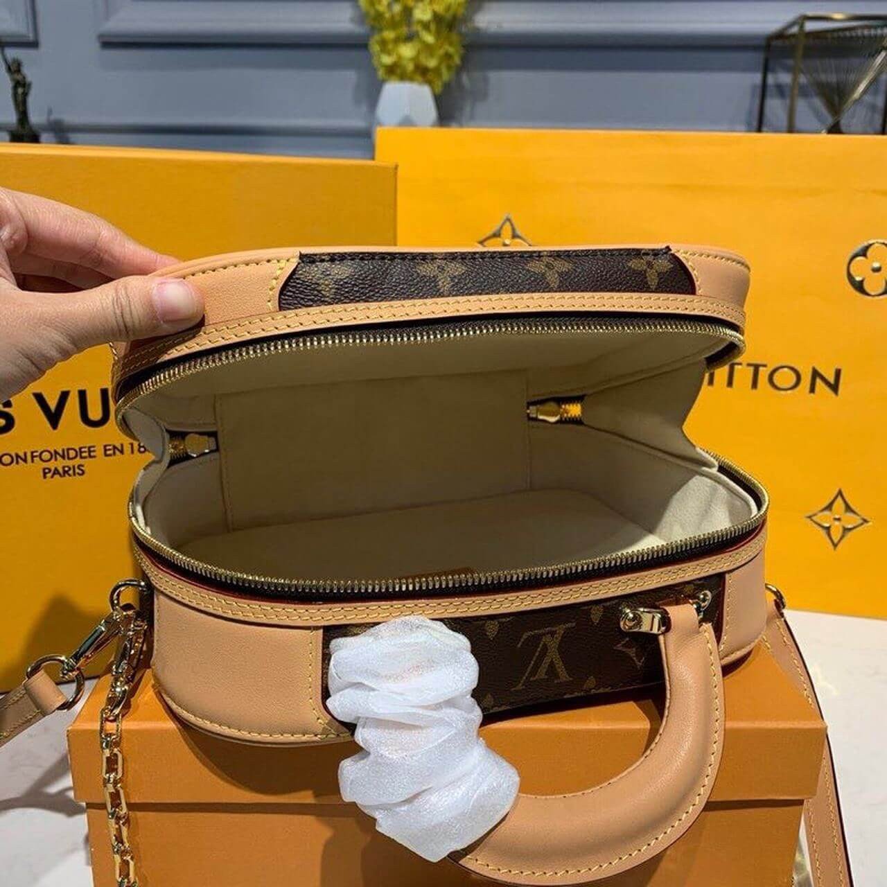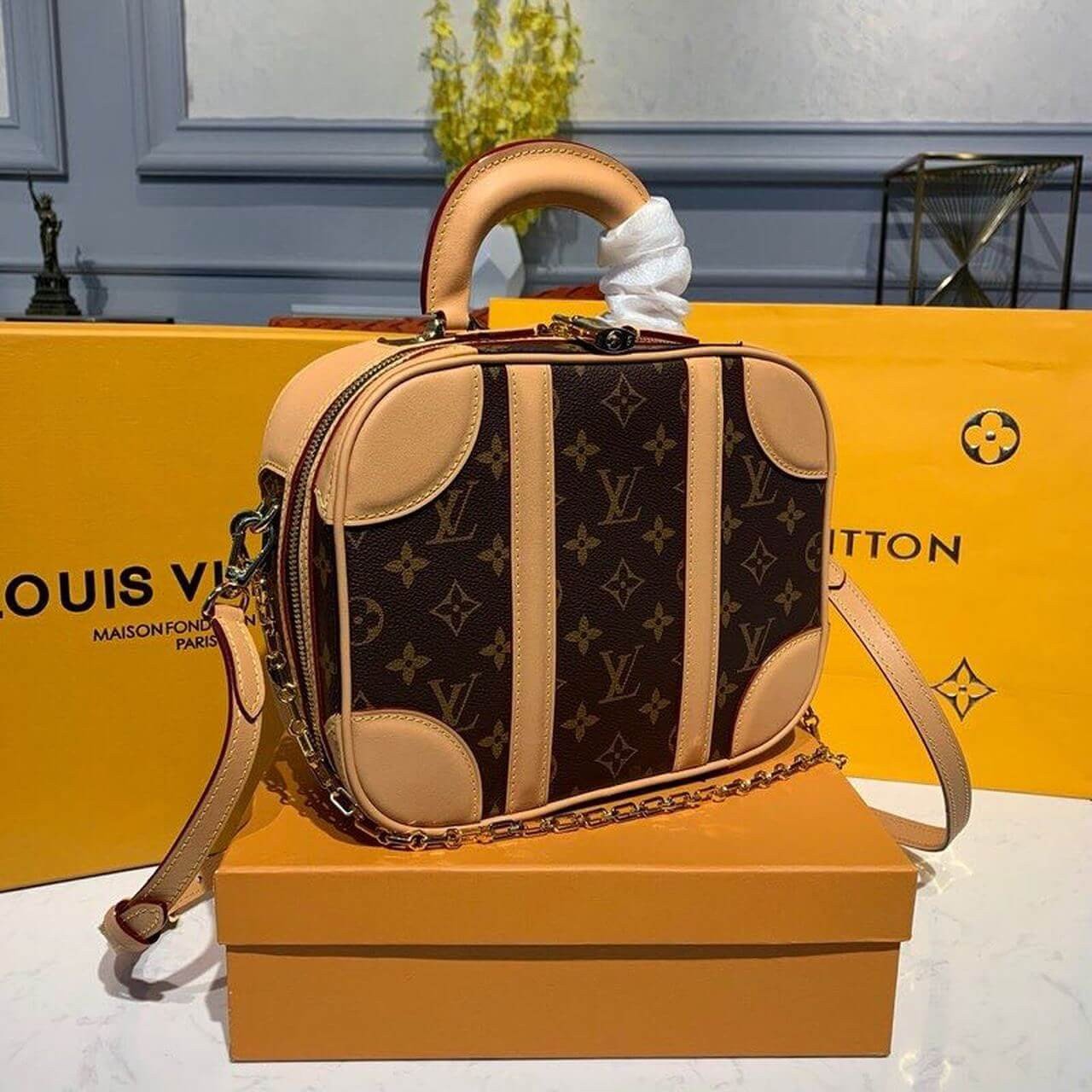 Inspired by the House’s travel heritage, Nicolas Ghesquière created the Valisette PM handbag for the Spring-Summer 2019 show. Small and structured, this model in timeless Monogram canvas features reinforced corners and trim in signature aged VVN cowhide, for an accessory with retro-cool appeal. The top handle, strap and chain offer a number of fashionable carry options.