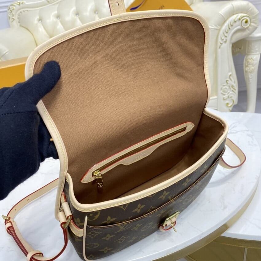 – Monogram canvas, adjustable leather shoulder strap, brown canvas lining