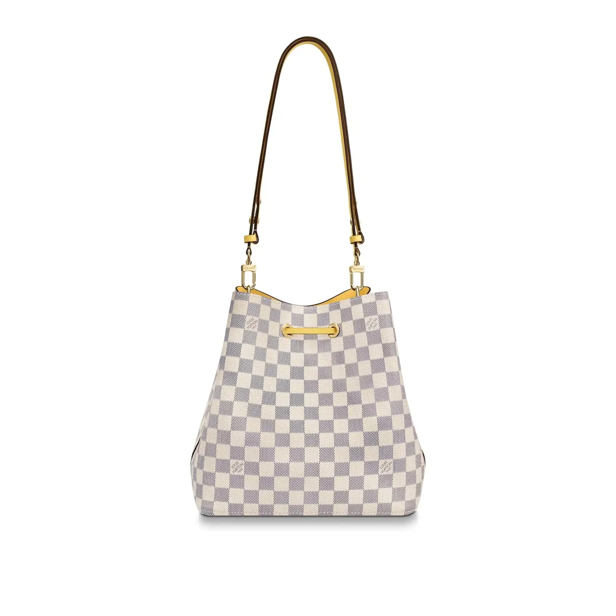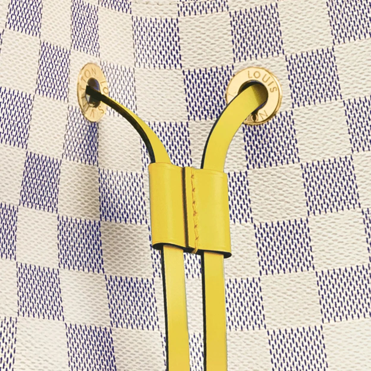 This limited edition of the NéoNoé bucket bag in Damier Azur canvas captures the very spirit of summer with its pastel leather trim and colorful coordinated lining. It will bring a sunny, seasonaltouch to any beach-to-city outfit, either slung over the shoulder or worn cross-body, thanks to the removable, adjustable strap.Detailed Features10.24 × 10.24 × 6.89 inches(Length x Height x Width)·L 10.2 × H 10.2 × W 6.9 inches·Pineapple Yellow·Damier Azur coated canvas·Smooth cowhide trim·Microfiber bonded lining·Gold-color hardware•Removable, adjustable leather strap with press button (drop: min. 33 cm/13 inches, max. 56 cm/22 inches) shoulder or cross-body carry•Drawstring closure·Inside zipped pocket