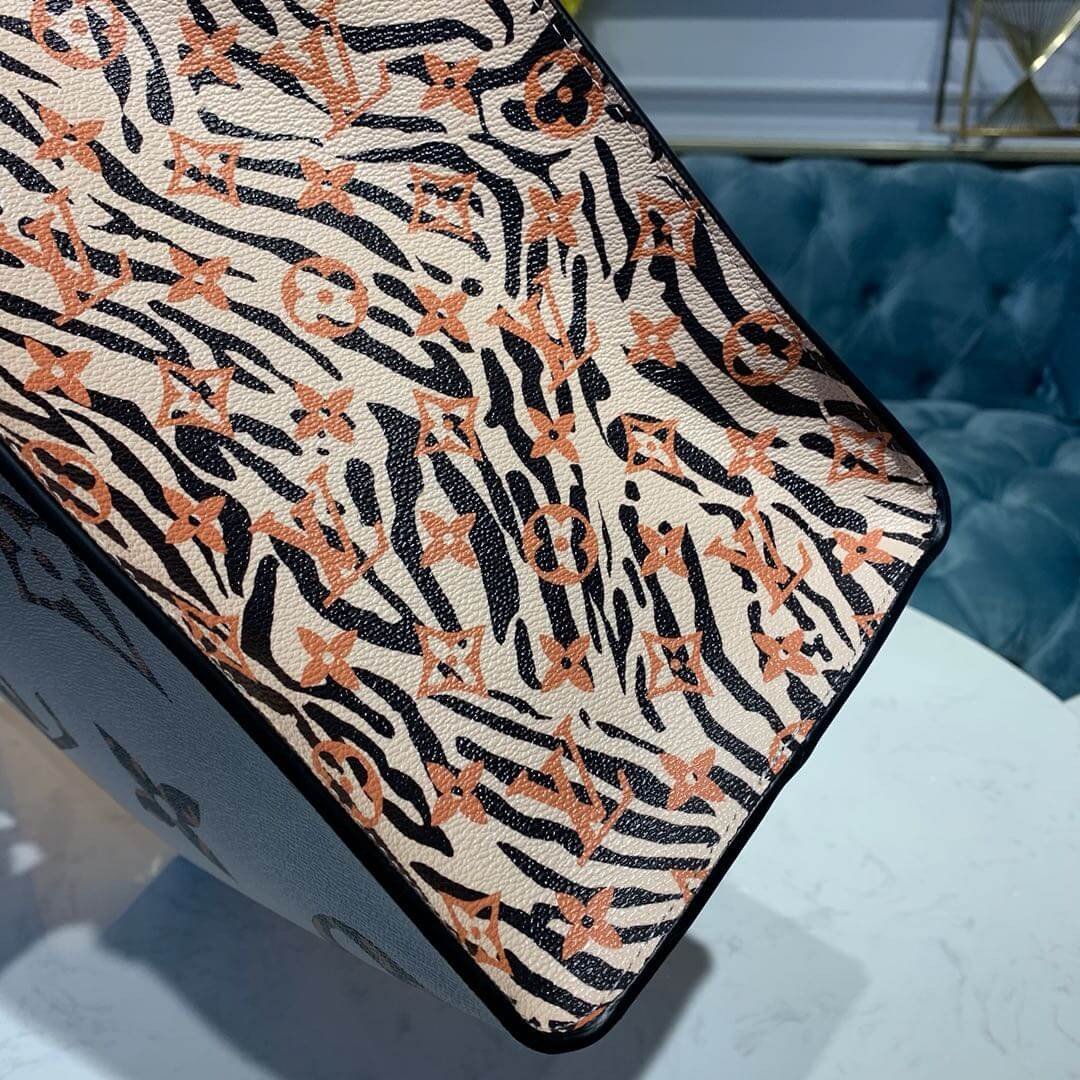 The Onthego tote bag takes on a bold new look in coated canvas with a print combining multiple sizes of the Monogram motif with leopard and zebra skin patterns. Its generous capacity, removable shoulder straps, and top handles make the Onthego perfect for everyday use.