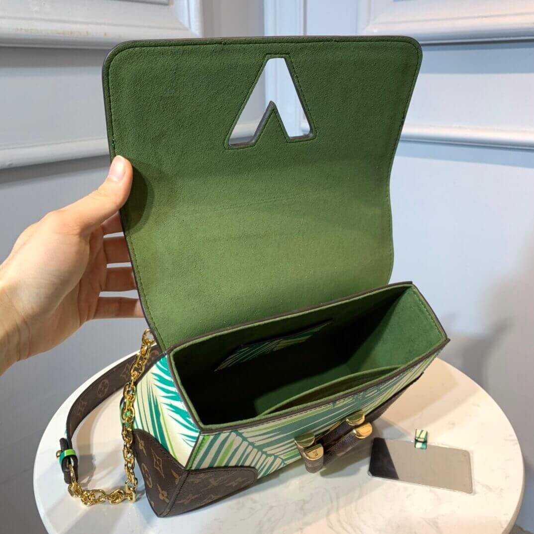 The Cruise Twist MM features a palm leaf printed leather body with monogram canvas trim, chain strap, front flap with LV twist lock closure, exterior flap pocket and interior slip pockets.