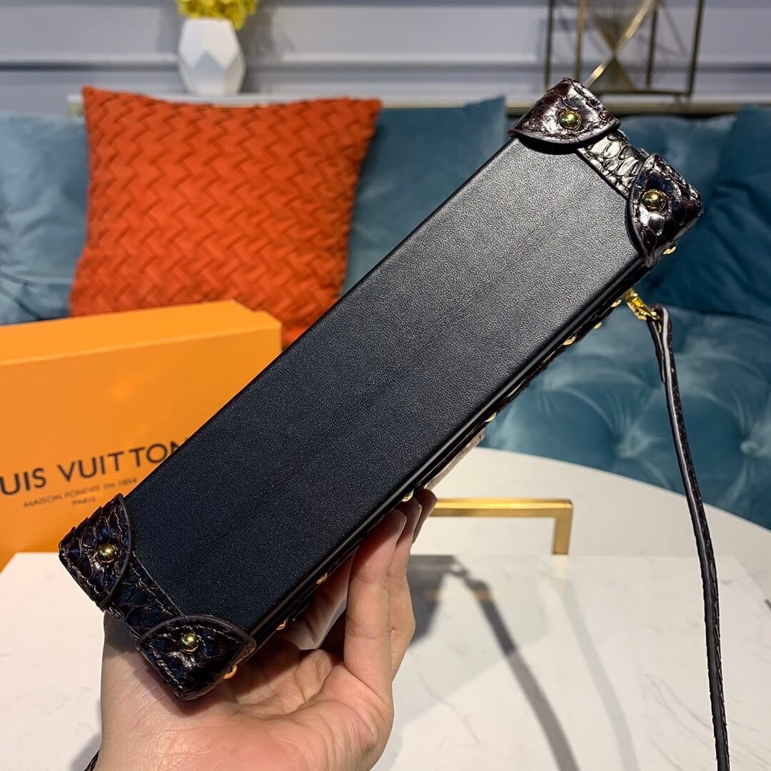 For Fall 2018, the exquisite Petite Malle handbag is crafted from black calf leather with exclusive exotic python-leather trim and a gold-color S-lock clasp. A sophisticated yet practical small bag perfect for evening use, it is Nicolas Ghesquière’s vision of the House’s original trunks and the spirit of travel they represented. The removable leather strap enables two carry options: clutch or cross-body.