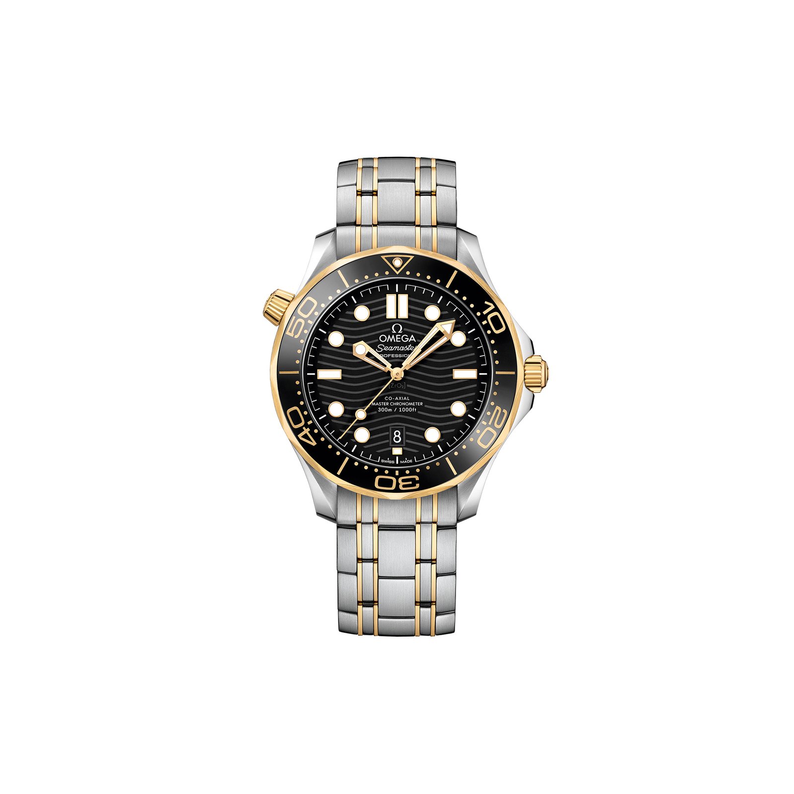 The watch is presented on a stainless steel and 18K yellow gold bracelet and is driven by the OMEGA Master Chronometer Calibre 8800, which can be seen through the sapphire-crystal on the wave-edged caseback.