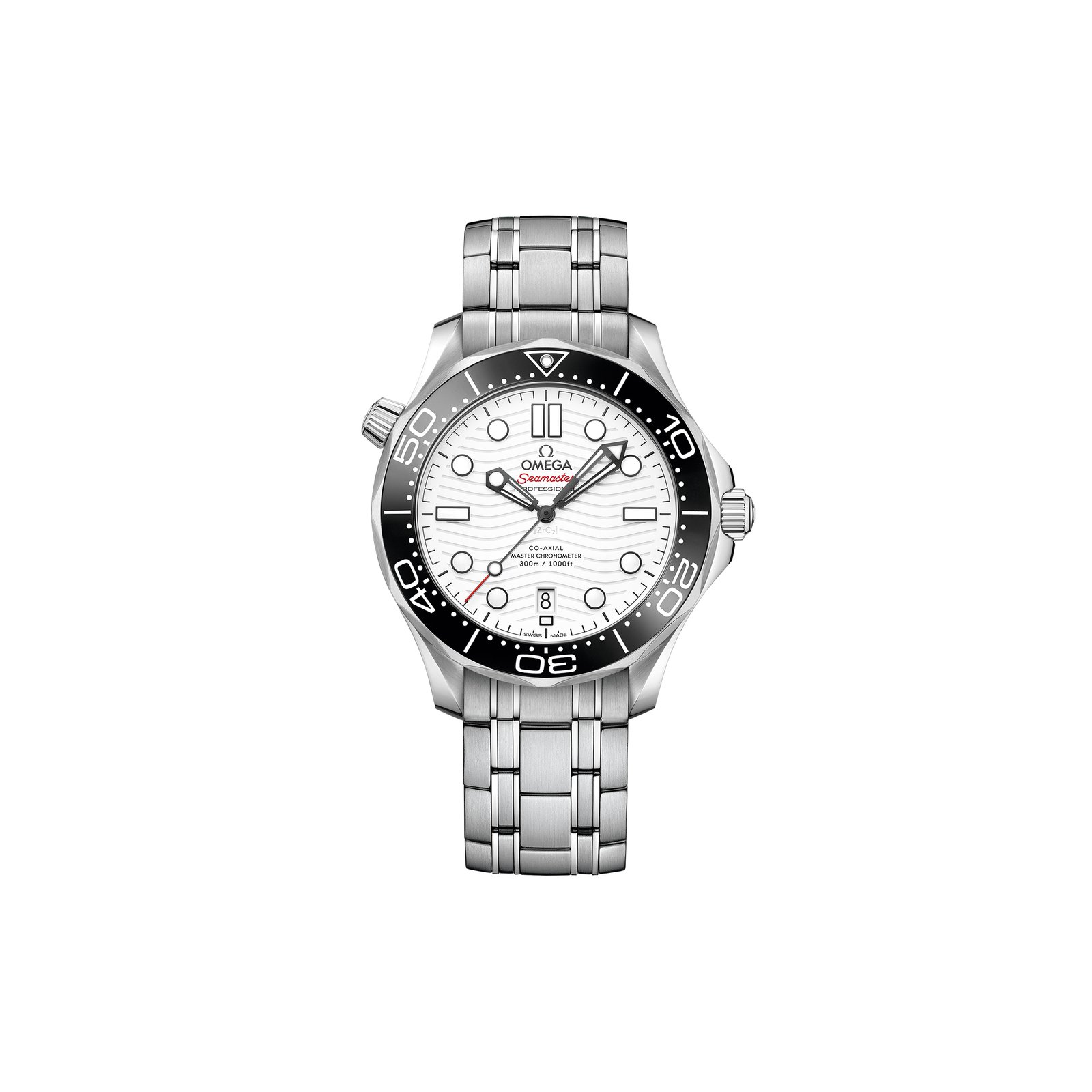 This 42 mm model is crafted from stainless steel and includes a black ceramic bezel with a white enamel diving scale. The dial is polished white ceramic and features laser-engraved waves and Seamaster highlighted in red.