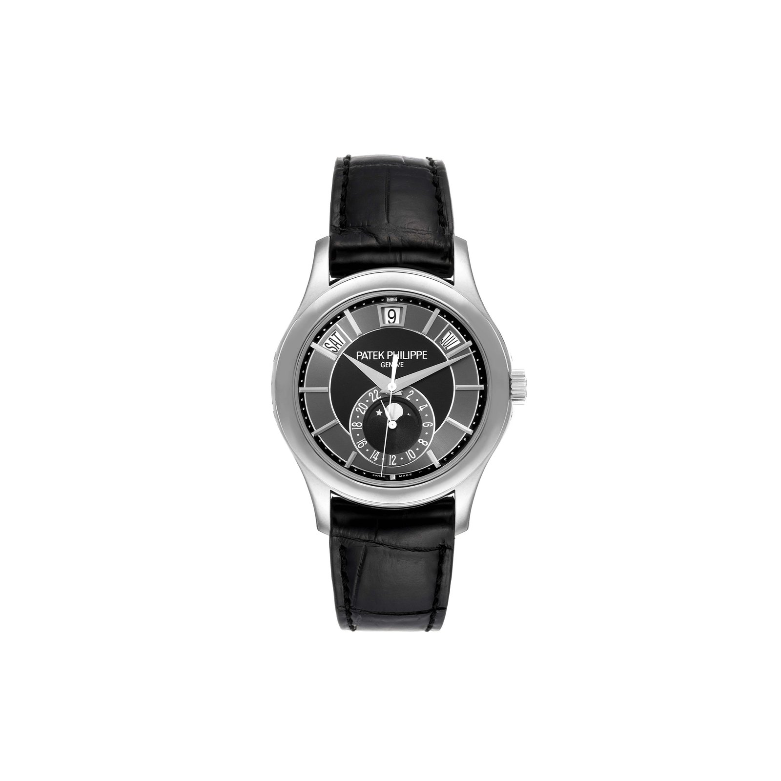 Patek Philippe Complications Annual Calendar White Gold Mens Watch 5205. Automatic self-winding movement. 18k white gold case 40.0 mm in diameter. Exhibition sapphire crystal case back. 18k white gold bezel. Scratch resistant sapphire crystal. Gray dial with applied white gold baton hour markers. White gold epee hands. Annual calendar complication displaying the Day, Date & Month through windows located beneath the 10, 12 and 2 o’clock positions. Sub-dial at the 6 o’clock position doubles as the Moon phase & an AM/PM indicator. Black leather strap with 18K white gold tang buckle.�