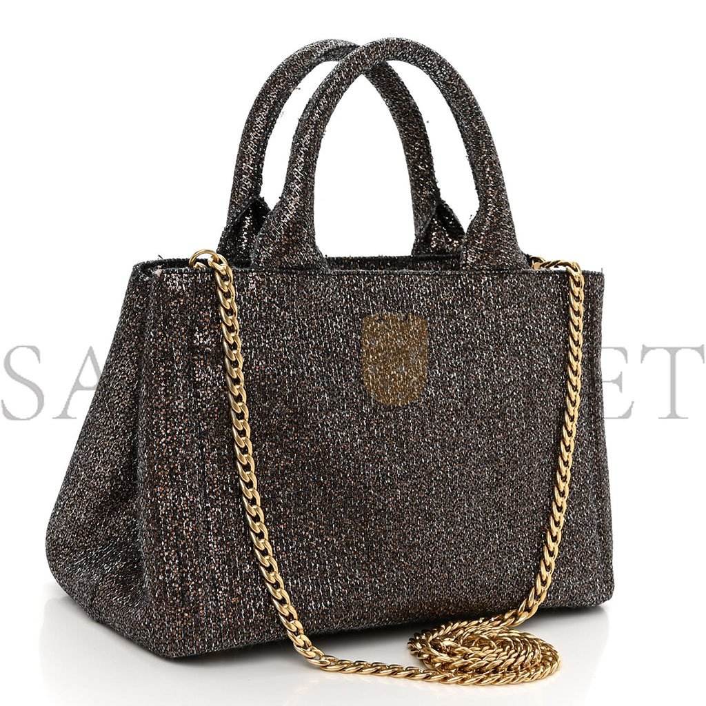 This is an authentic PRADA Broccato Chain Tote in Caff茅. This stylish tote is crafted of metallic bronze brocade fabric. The bag features rolled and reinforced top handles, a gold chain shoulder strap and a broad open top. The top opens to a black interior with zipper and patch pockets.