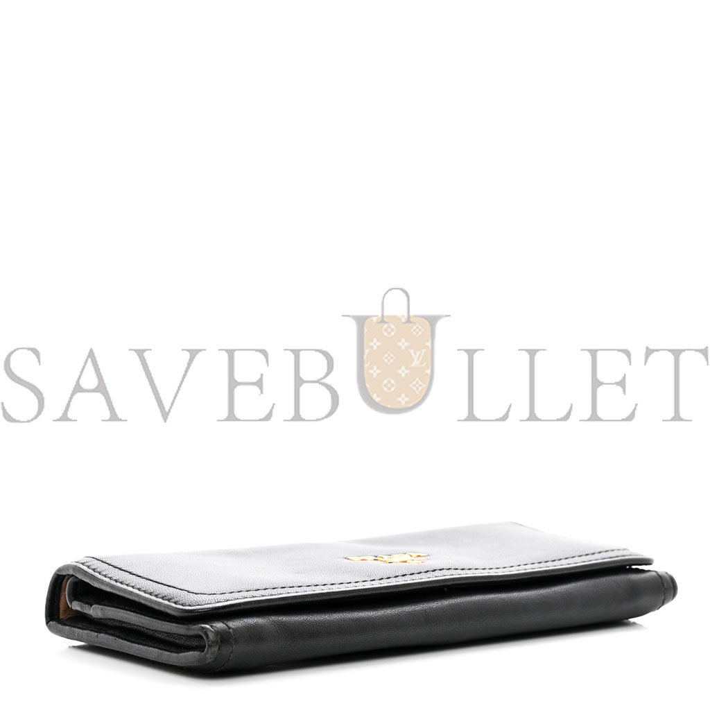 This is an authentic PRADA Calfskin Continental Flap Wallet in Black. This wallet is finely crafted of cross grain textured saffiano leather in black. It�unsnaps to a compact�black leather interior with bill and credit card slots, and a zipper compartment.