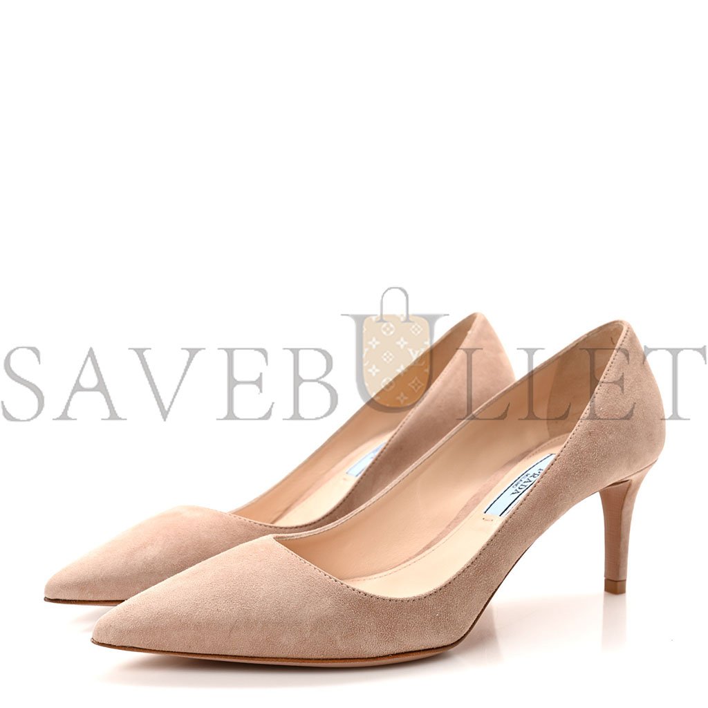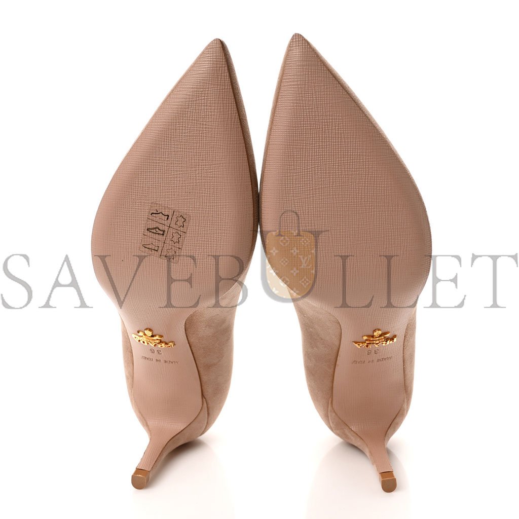 This is an authentic pair of PRADA Camoscio 65mm Pumps size 36 in Beige. These pumps are made of beige suede leather and feature a 2.75 inch heel.