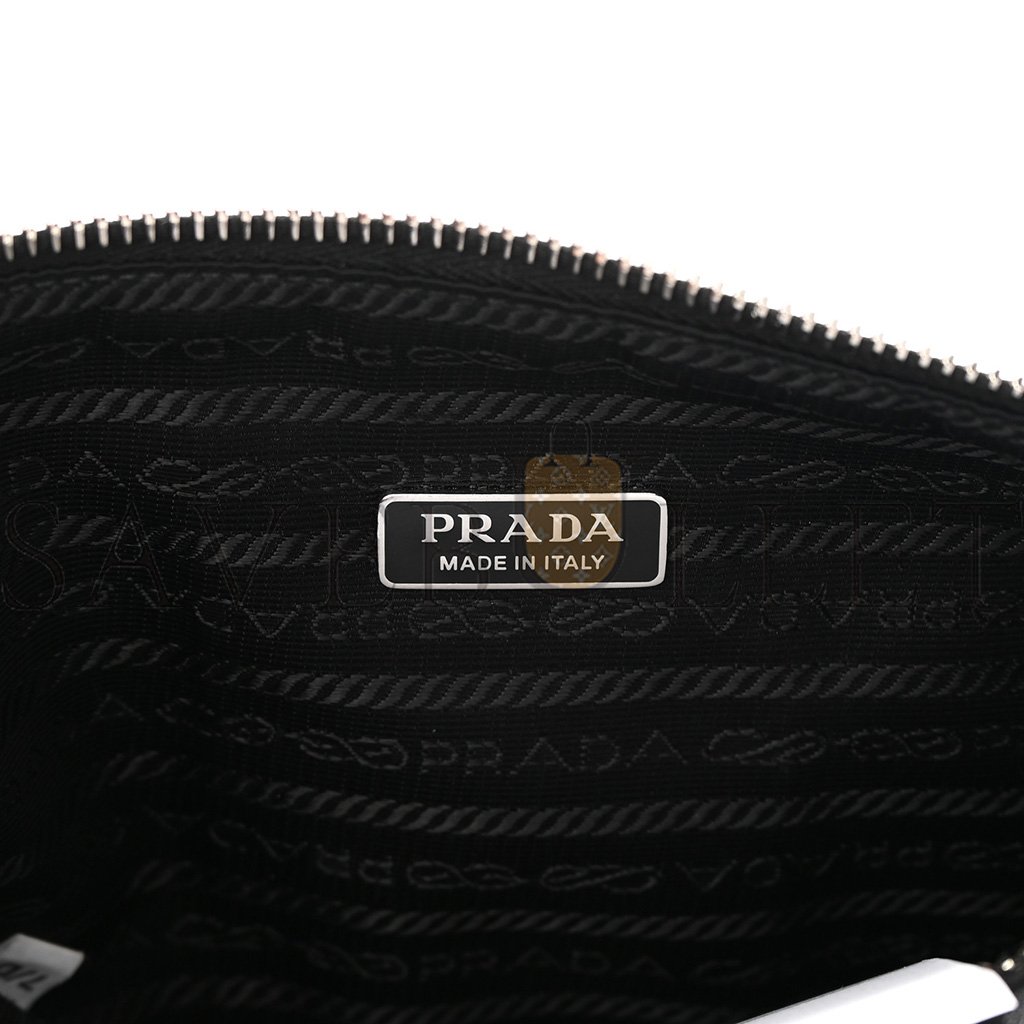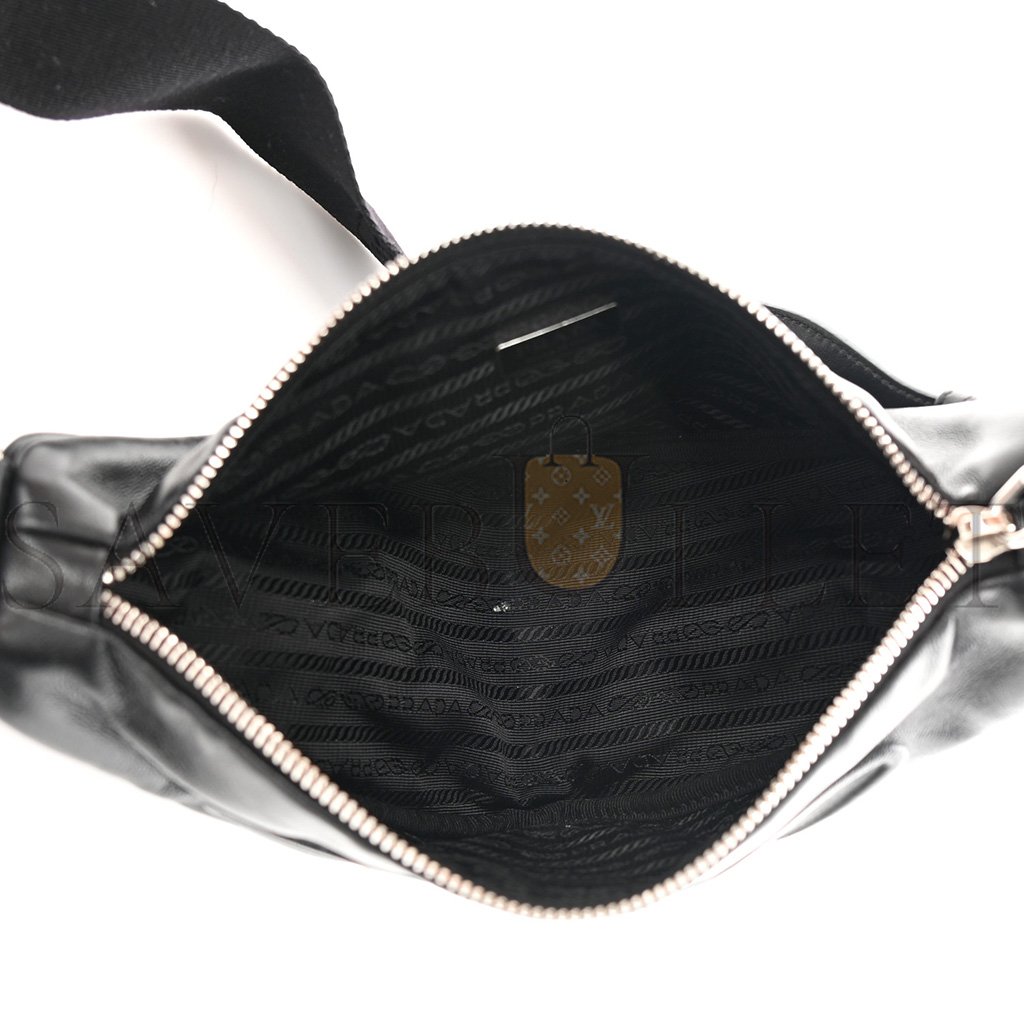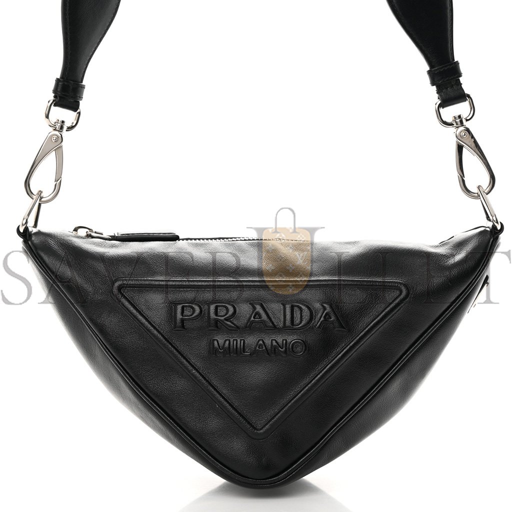 This is an authentic PRADA Grace Lux Triangle Shoulder Bag in Black. This stylish tote is crafted of black leather and features a black nylon shoulder strap with silver hardware. The bag opens to a black nylon jacquard interior.