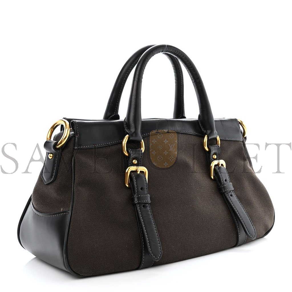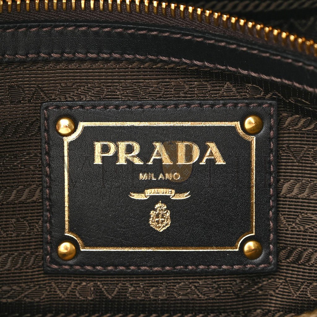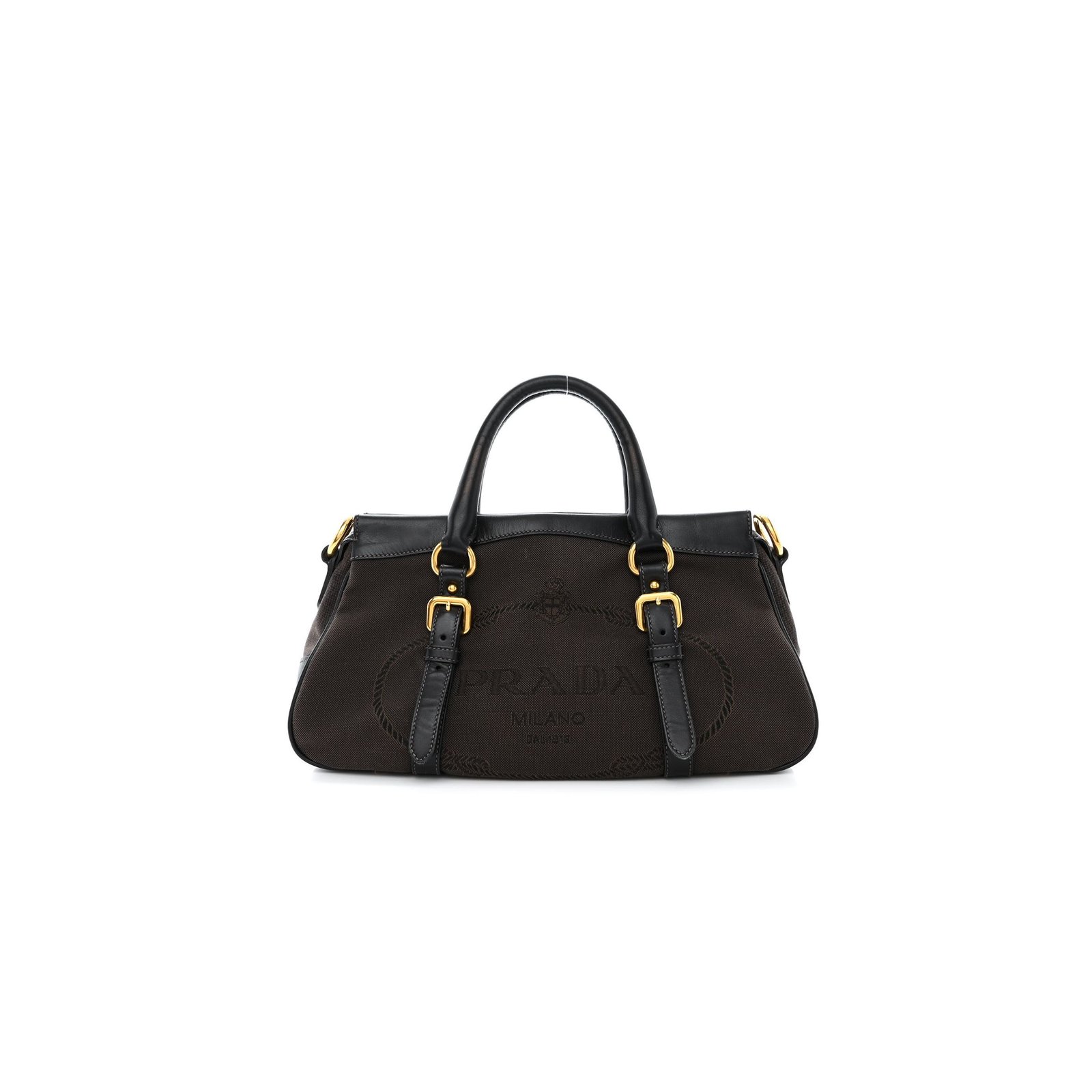 This is an authentic PRADA Jacquard Logo Tote in Corda Bruciato. This handbag is crafted of dark brown jacquard fabric featuring a large Prada crest and logo, with a black leather trim. The bag has polished gold hardware and rolled leather top handles. The top is open to a partitioned Prada monogrammed fabric lining with a zipper pocket.