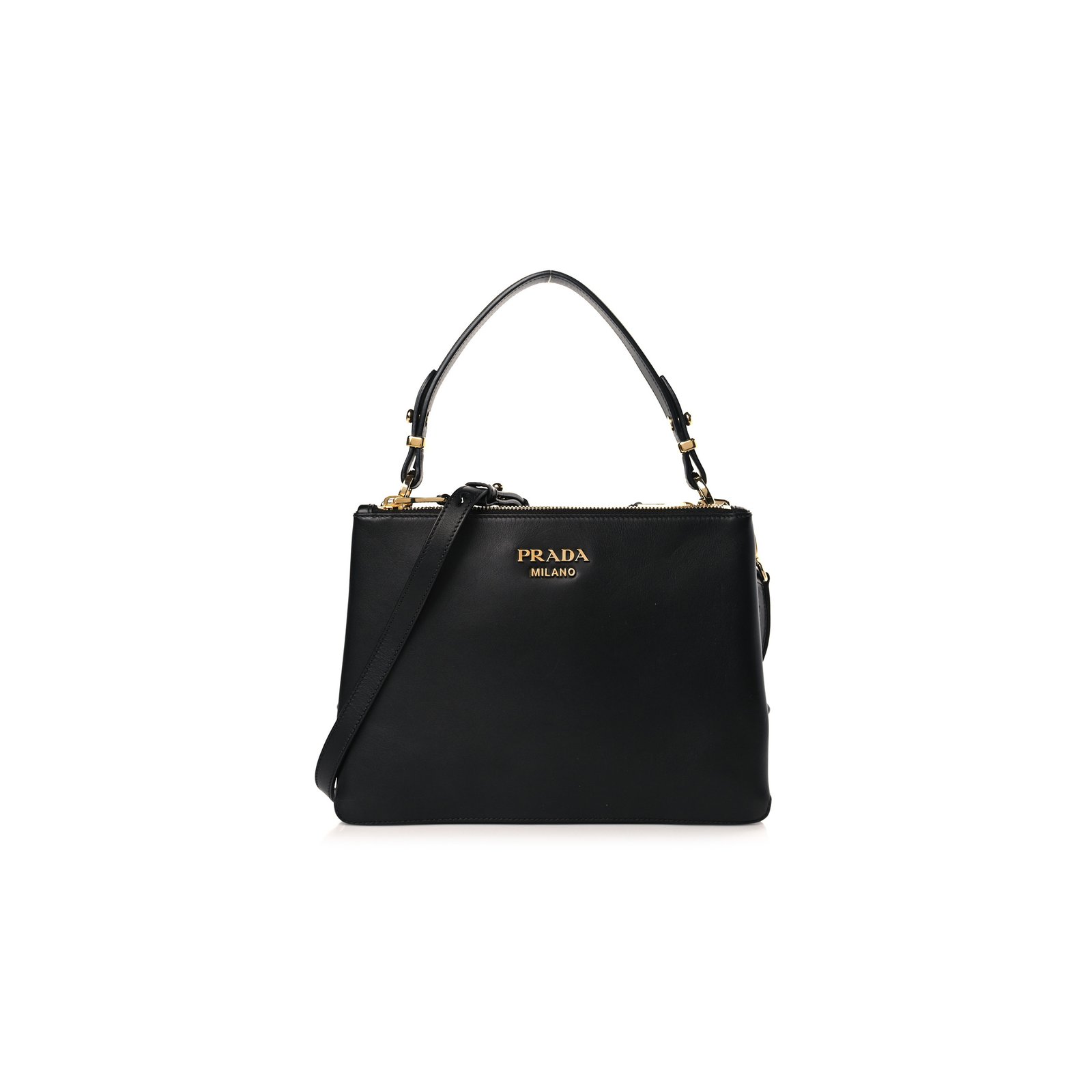 This is an authentic PRADA New Calfskin Small Deux Shoulder Bag in Black. The bag features a leather top handle, an optional shoulder strap, and snap sides for expansion. The top is open to a black leather interior with a central black leather flap compartment.