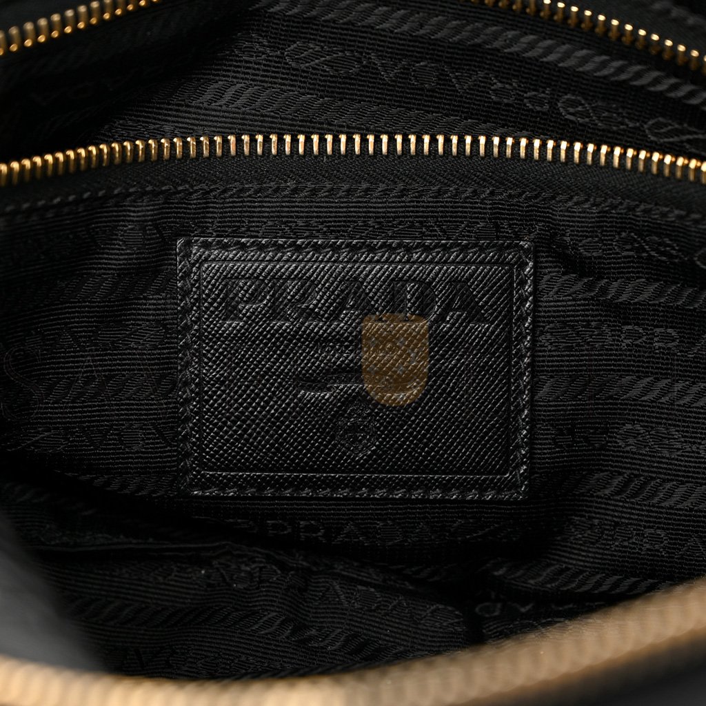 This is an authentic PRADA Nylon Animalier Boston Bag in Black. This stylish bag is crafted of fine nylon in black. The purse features black leather top handles, a two gold buckles on the sides, and gold hardware. The top zipper opens to a Prada logo jacquard fabric interior with a zipper pocket.