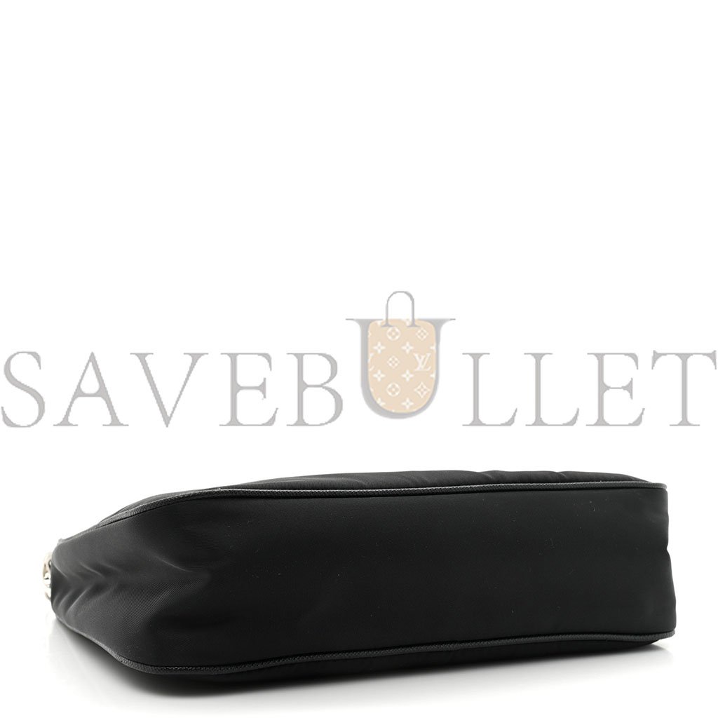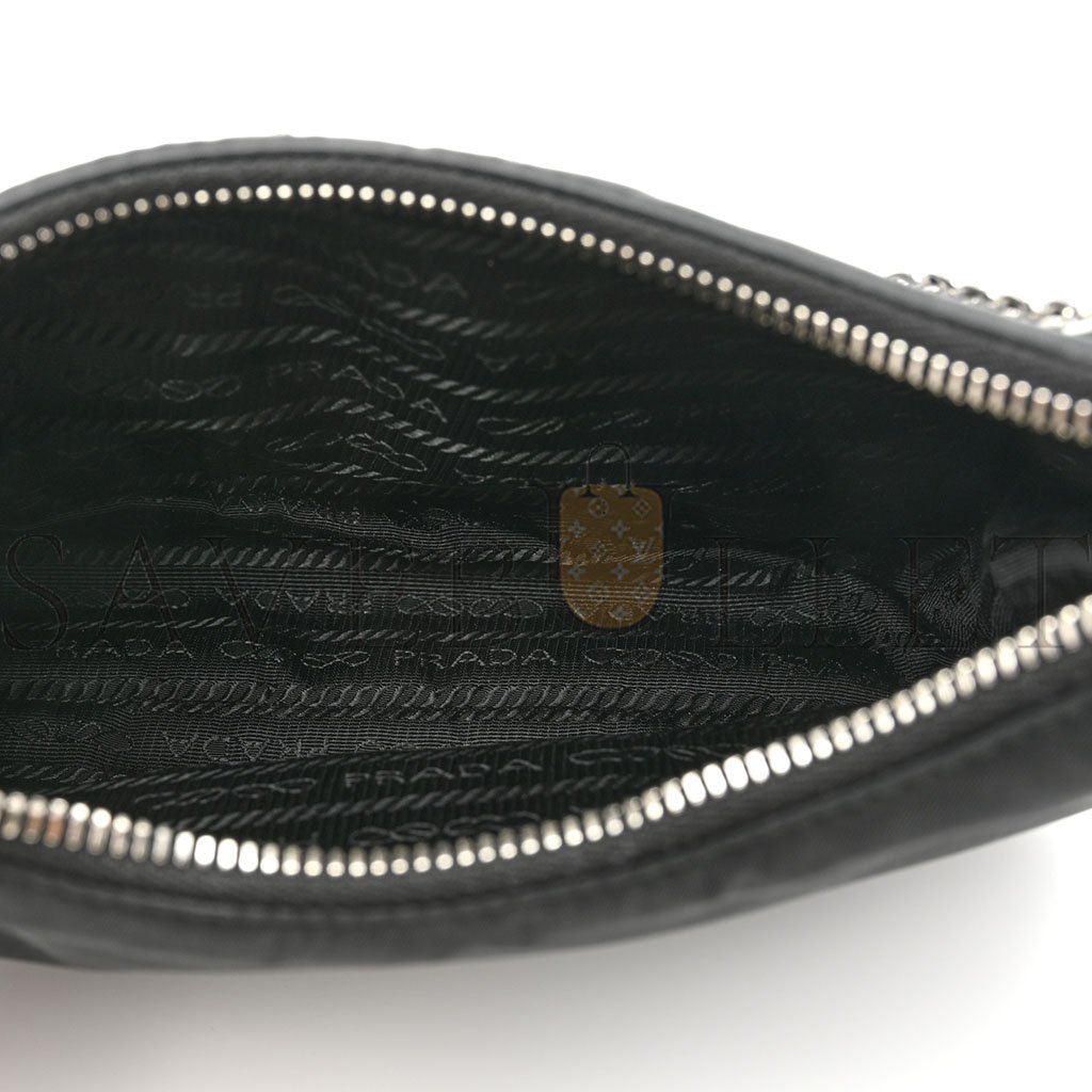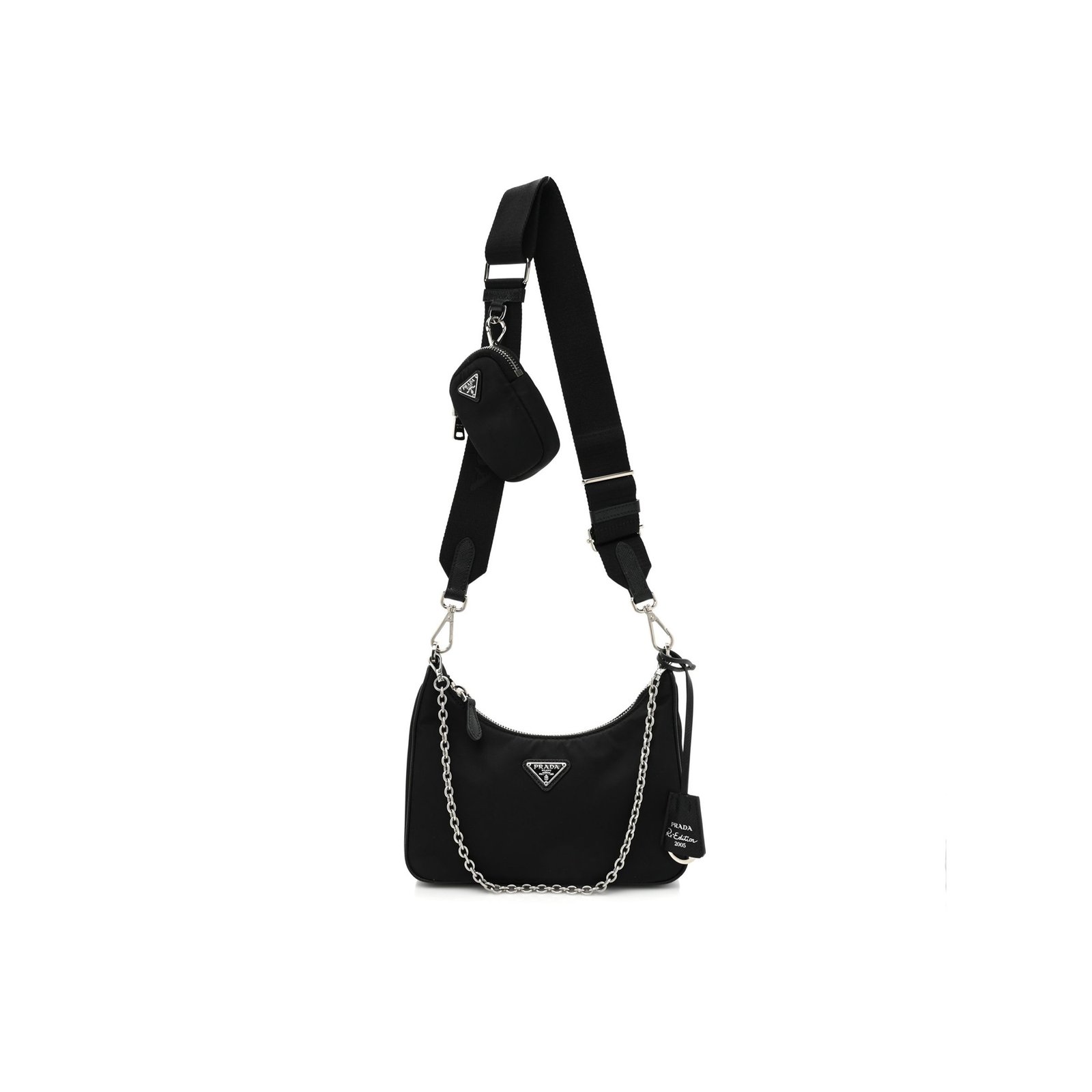 This is an authentic PRADA Nylon Re-Edition 2005 Shoulder Bag in Black. This petite messenger bag is crafted of fine nylon in black with matching black saffiano leather trim and silver hardware. The set features an adjustable black nylon shoulder strap and an optional silver chain-link strap. The top zipper opens to a black Prada monogram jacquard fabric interior.