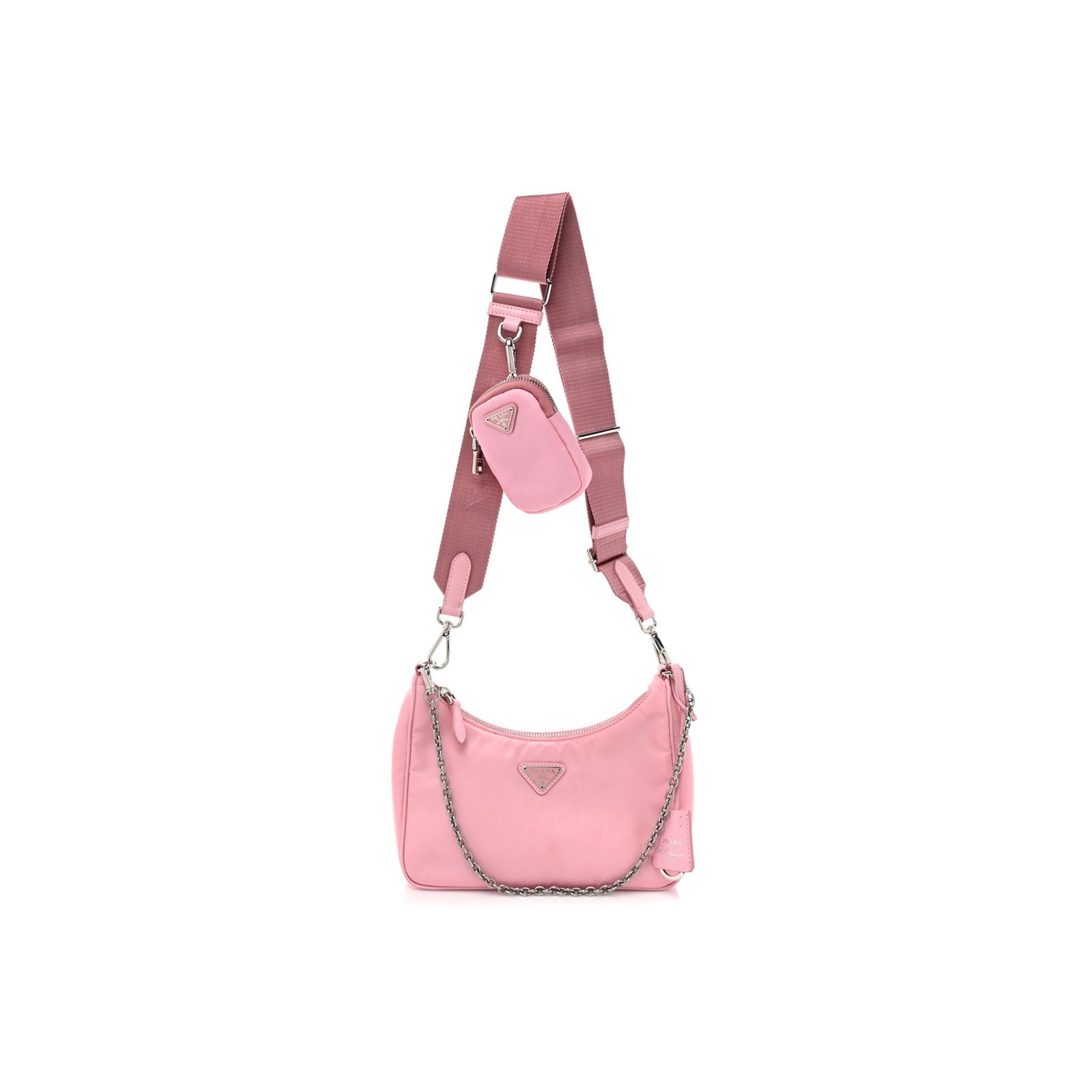 This is an authentic PRADA Nylon Re-Edition 2005 Shoulder Bag in Rosa. This petite messenger bag is crafted of pink nylon with polished silver hardware. It features saffiano cross-grain leather trim an adjustable pink nylon crossbody strap, a silver chain strap, and a removable coin purse. The top zipper opens to a pink Prada monogram jacquard interior.