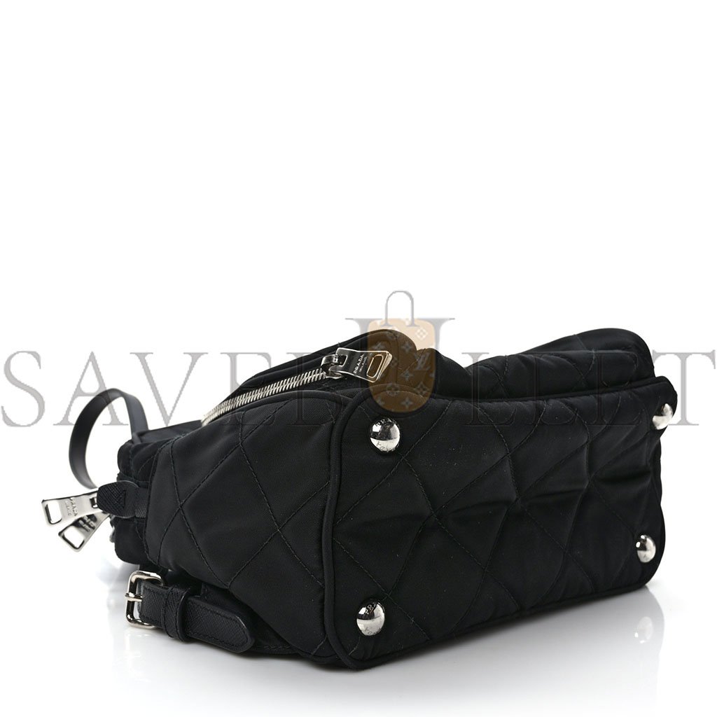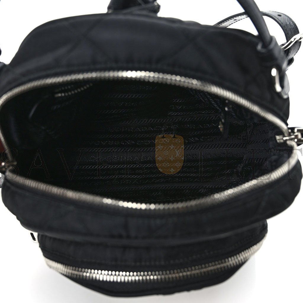 This is an authentic PRADA Nylon Tessuto Impuntu Quilted Backpack in Black. This stunning backpack is beautifully crafted of black diamond-quilted tessuto nylon. The bag features a black leather handle, black leather shoulder straps, and a silver Prada logo. The top zipper opens to a black Prada logo jacquard weave interior with zipper and patch pockets.