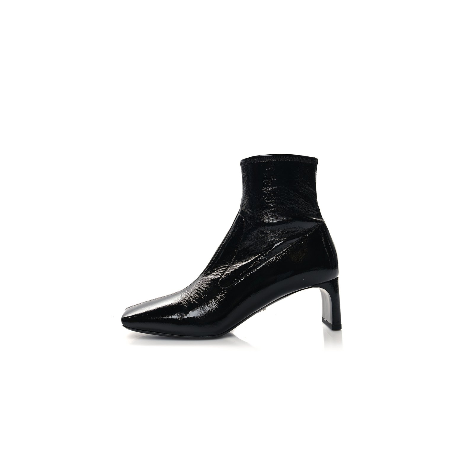 This is an authentic pair of PRADA Patent Naplak Tech Square Toe 55mm Ankle Boots size 40.5 in Black. These ankle boots are crafted of patent leather. They feature a 3 in heel and a square toe.