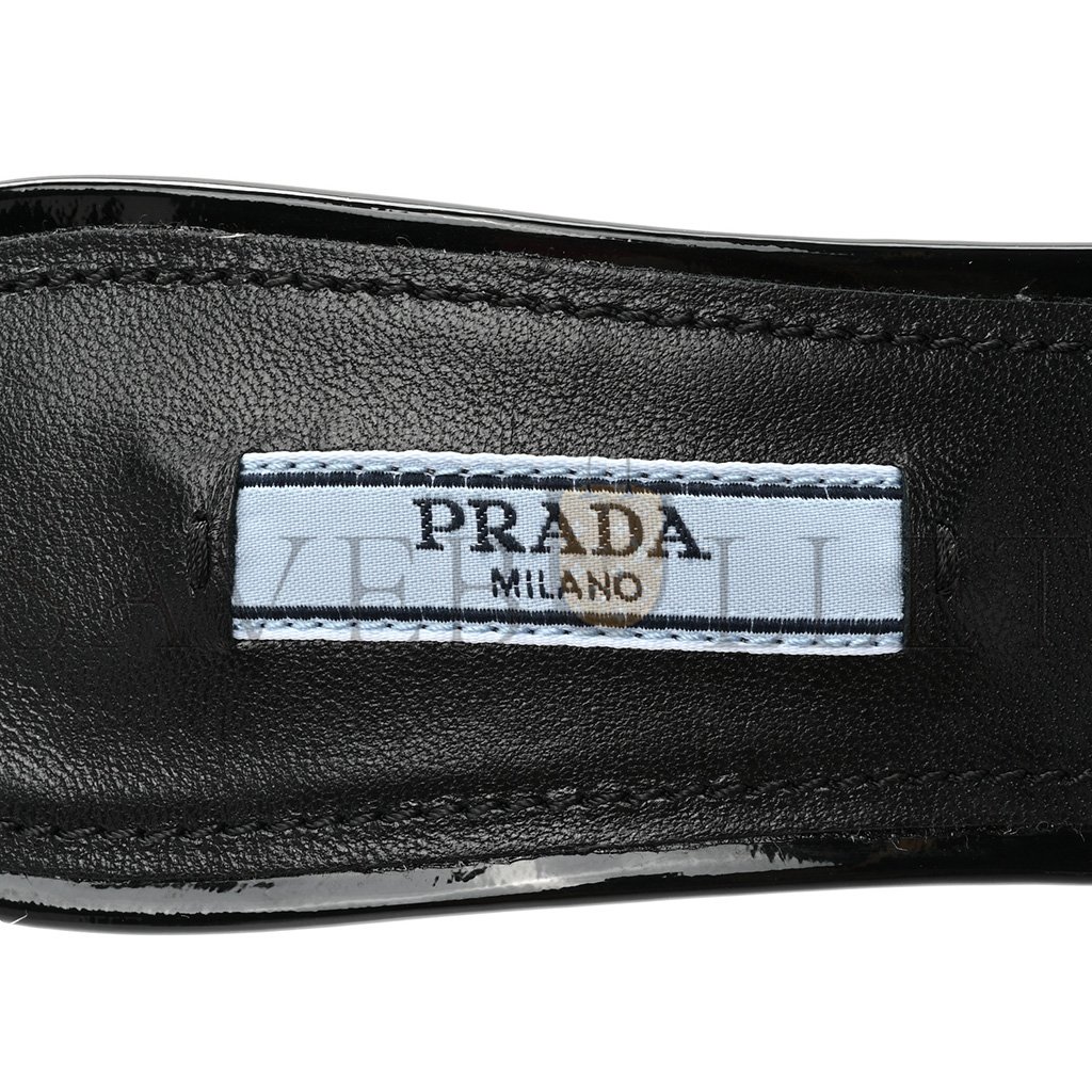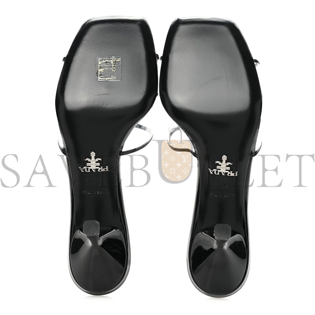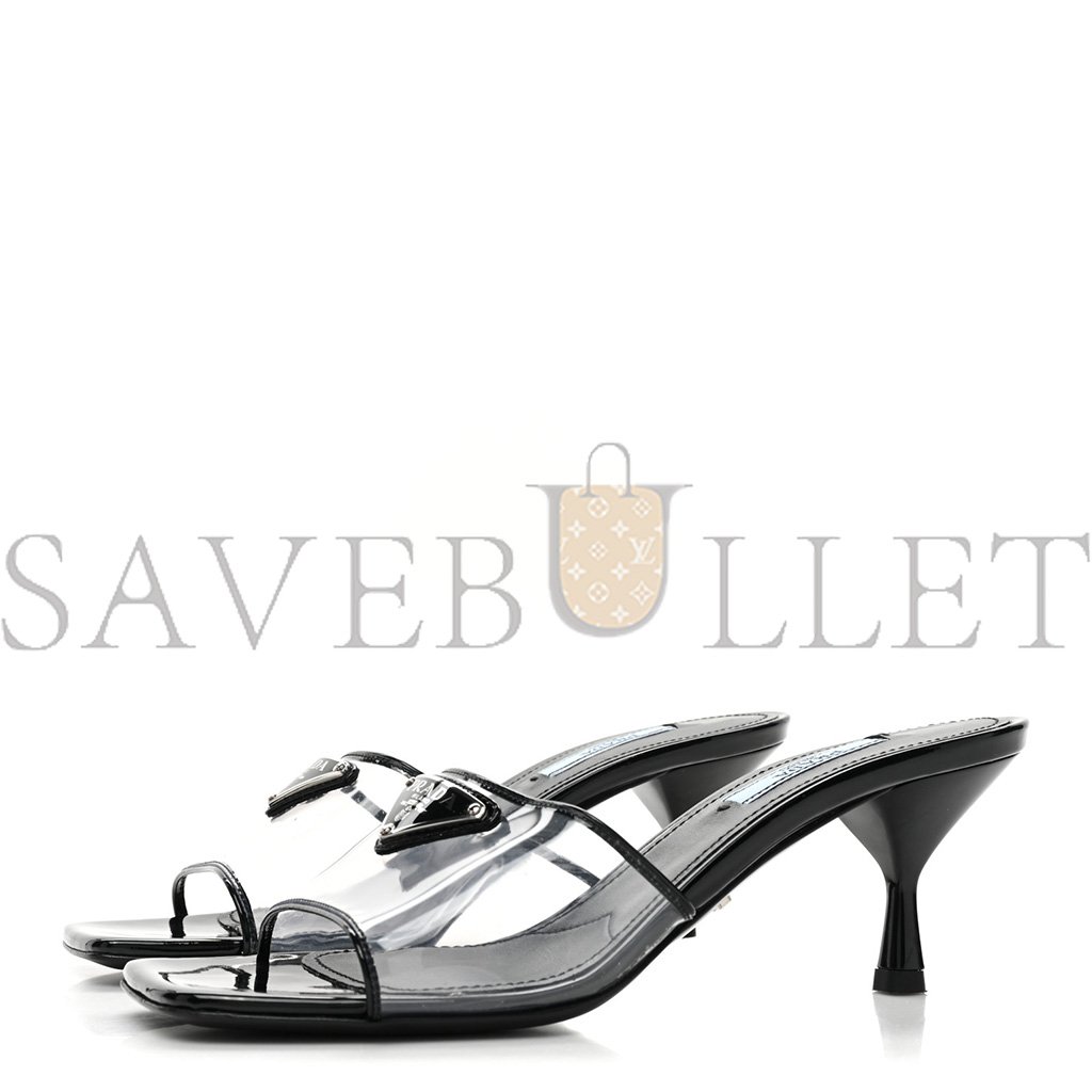 PRADA PLEXIGLASS VERNICE METAL TRIANGLE LOGO 65MM SLIDE SANDALS 36.5 BLACK