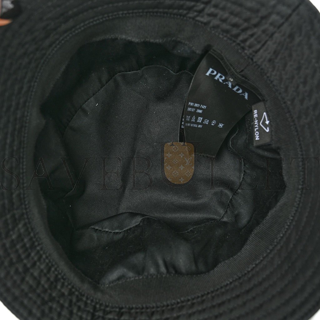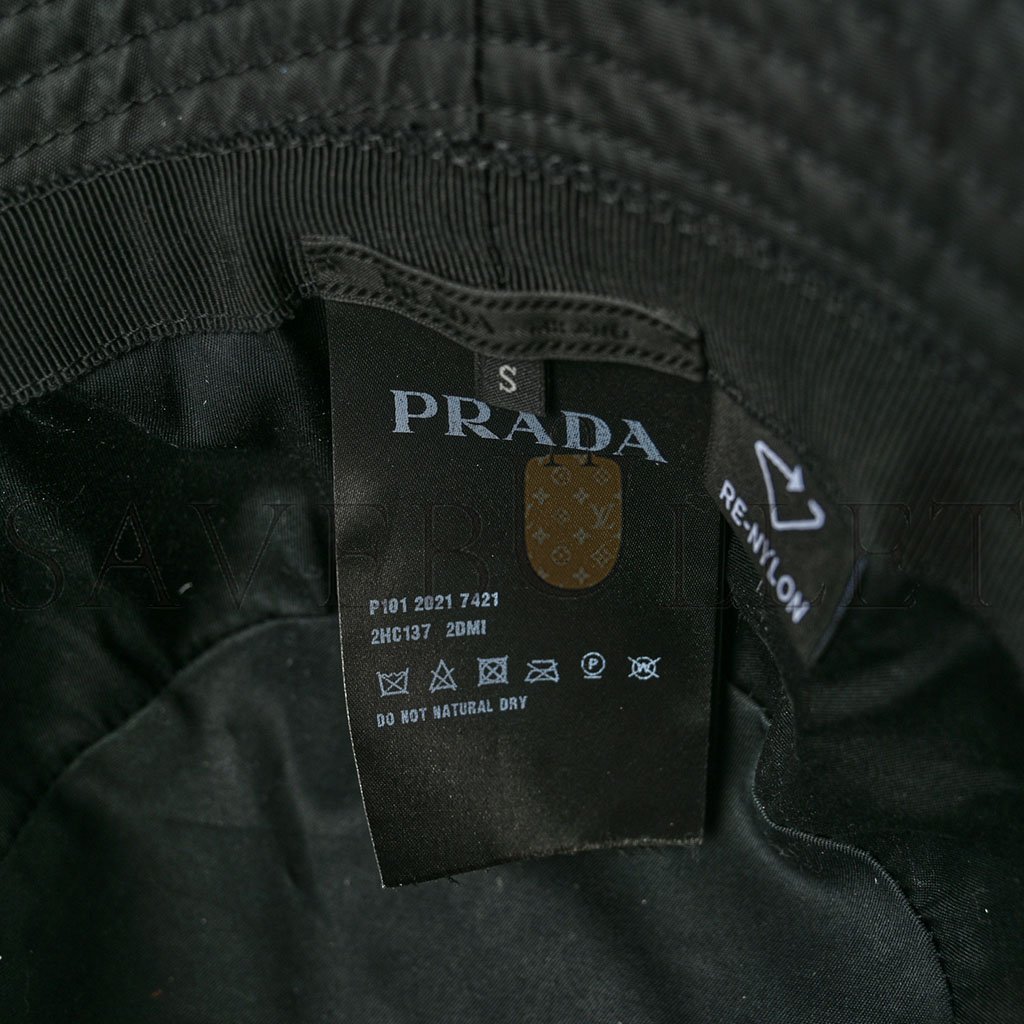 This is an authentic PRADA Re-Nylon Bucket Hat size S in Black. This stylish bucket hat is in black nylon fabric with a silver and black Prada logo at the front.