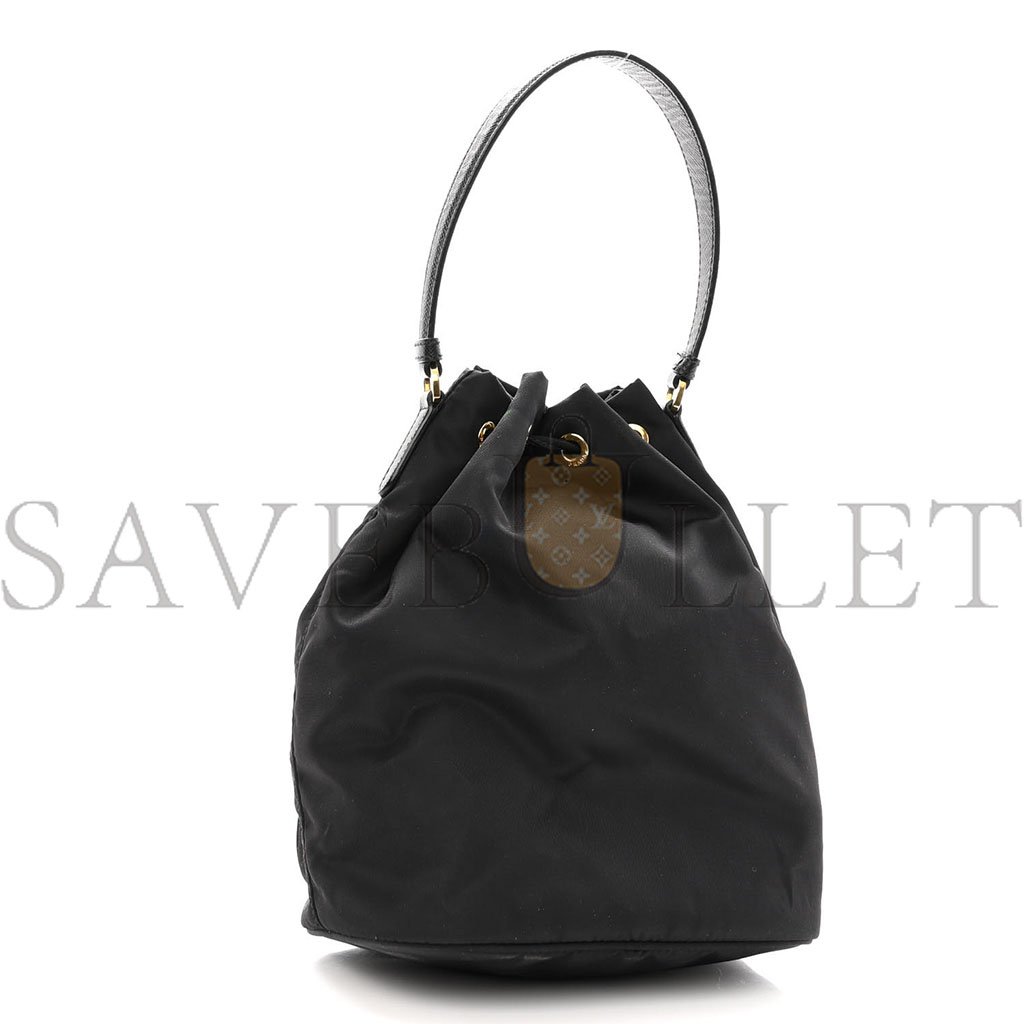 This is an authentic PRADA Re-Nylon Duet Drawstring Shoulder Bag in Black. This stylish bag is crafted of nylon in black. The bag features a front facing zipper pocket, a top cinch strap, an optional leather shoulder strap and polished gold buckles and links. The top opens to a black monogram Prada jacquard fabric interior.