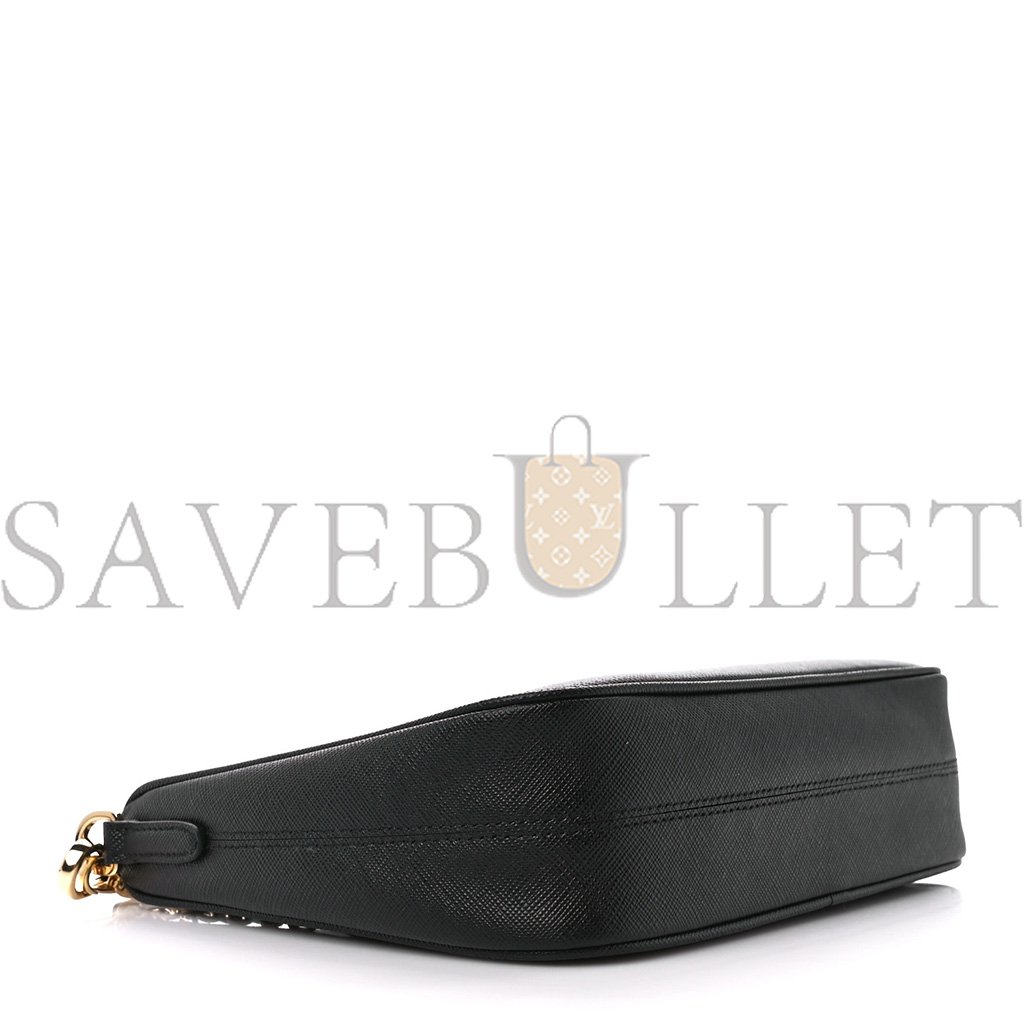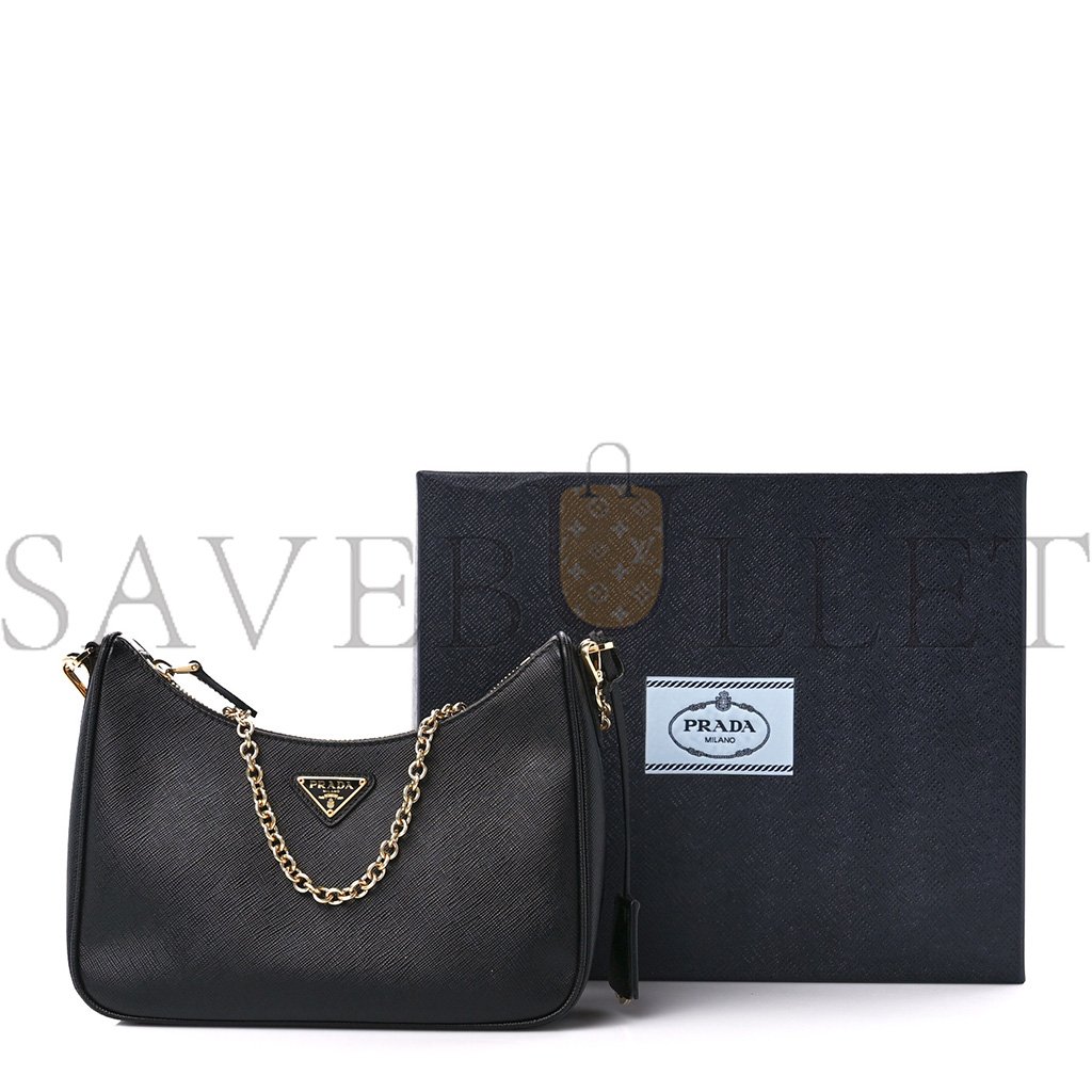 This is an authentic PRADA Saffiano Lux Re-Edition 2005 Shoulder Bag in Black. This chic shoulder bag is crafted of Prada signature saffiano crossgrain leather in black. The set features an adjustable black nylon shoulder strap, an optional gold chain-link strap, polished gold hardware, and a coin purse. The top zipper opens to a black Prada monogram jacquard fabric interior.