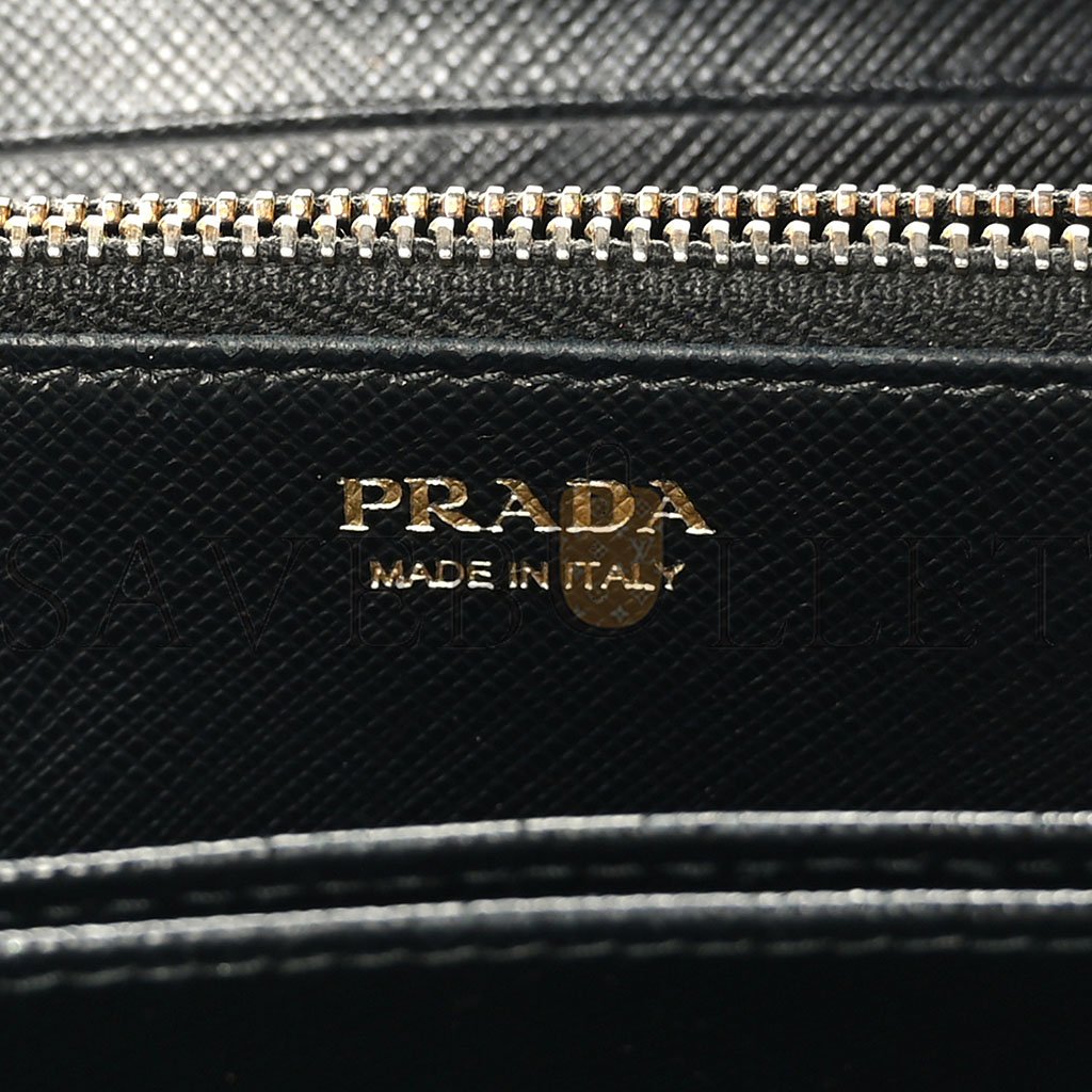 This is an authentic PRADA Saffiano Metal Zip Around Wallet in Black. The wallet features a 3/4 gold wrap-around zipper that opens to a partitioned matching cross-grain leather interior with card slots, patch pockets, and a zipper compartment.