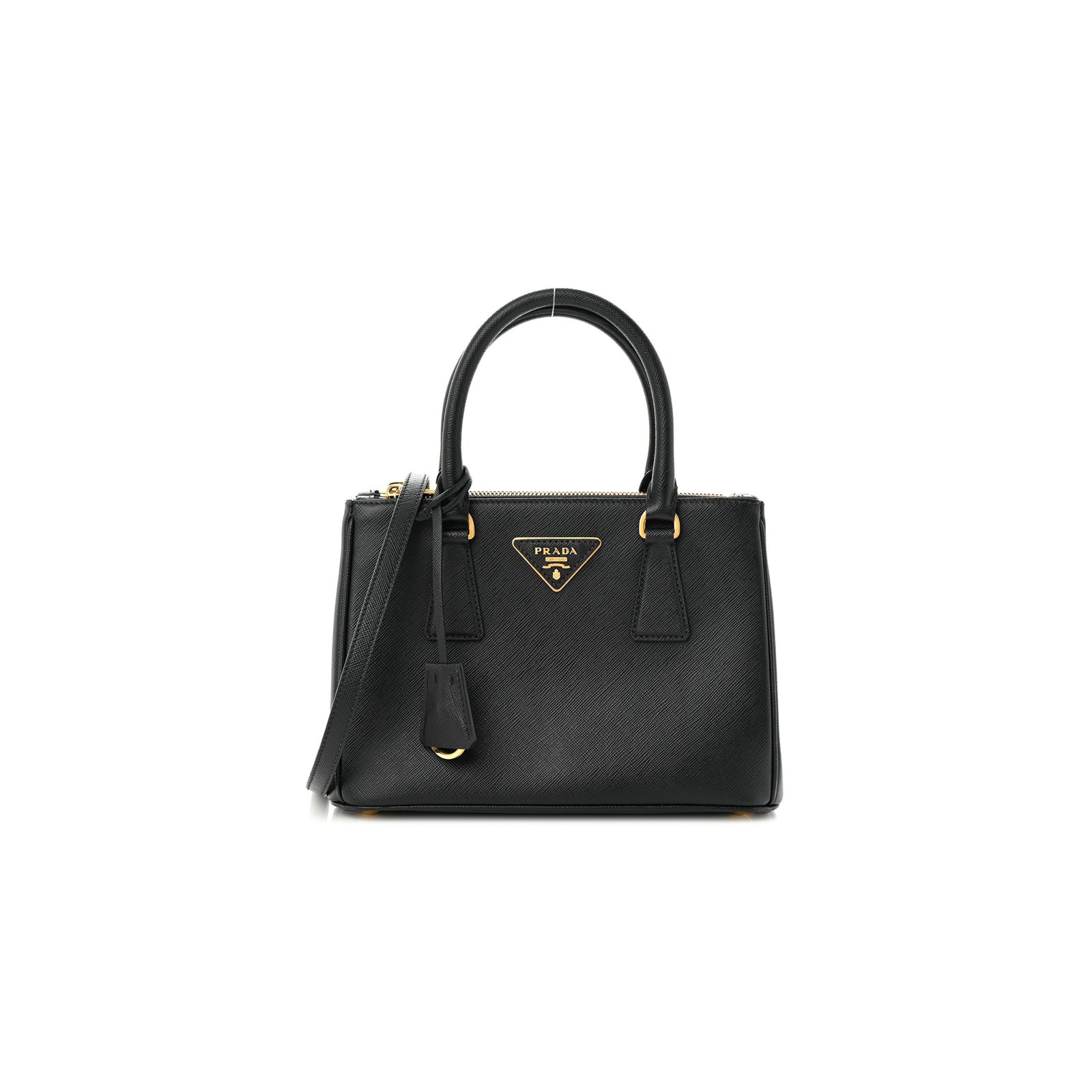 This is an authentic�PRADA Saffiano Small Galleria Double Zip Tote in Black. This chic tote is finely crafted of Saffiano cross-grain leather in black with gold hardware. The bag features rolled leather top handles with polished gold links. The bag opens to a black fabric interior and features two full length zippered compartments and smaller zipper and patch pockets.